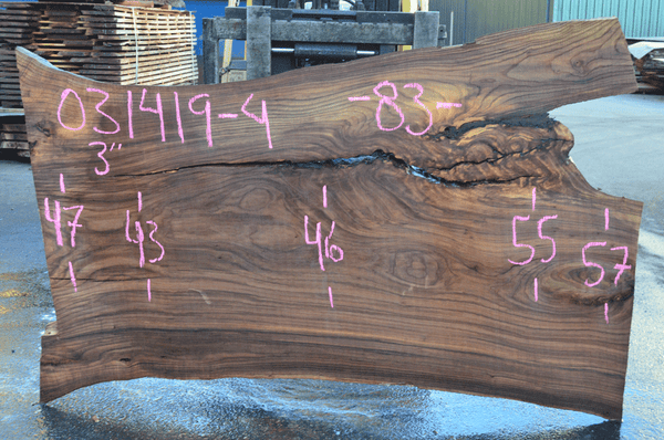 Black Walnut slab from Goby Walnut measuring 3.25" thick x 50"-46"-46" wide x 127" long
