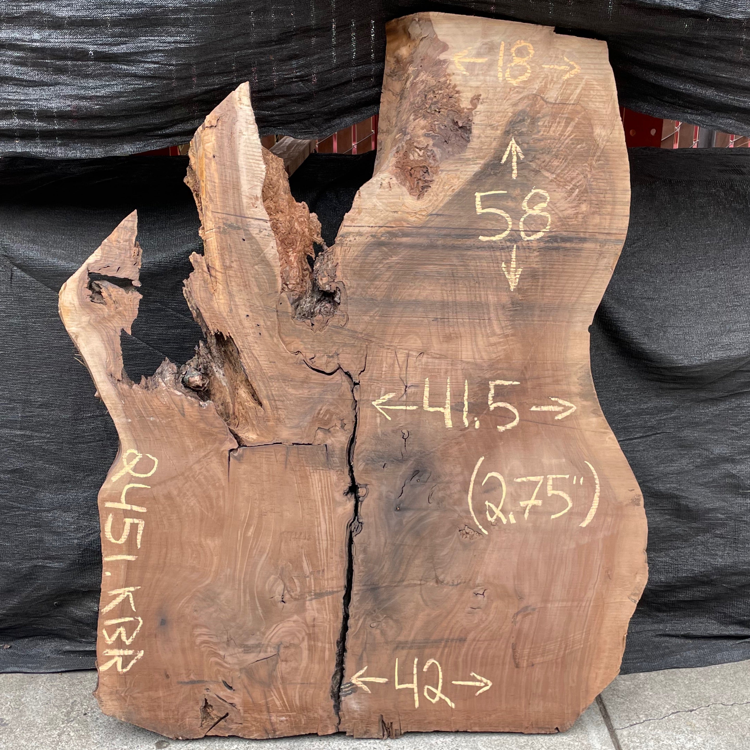 English Walnut slab from Peroba Reclaimed measuring 2.75" thick x 18"-41.5"-42" wide x 58" long