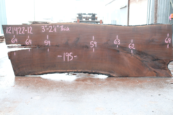 Black Walnut slab from Goby Walnut measuring 3"-2.5" thick x 64"-64"-59"-59"-63"-62"-64" wide x 195" long