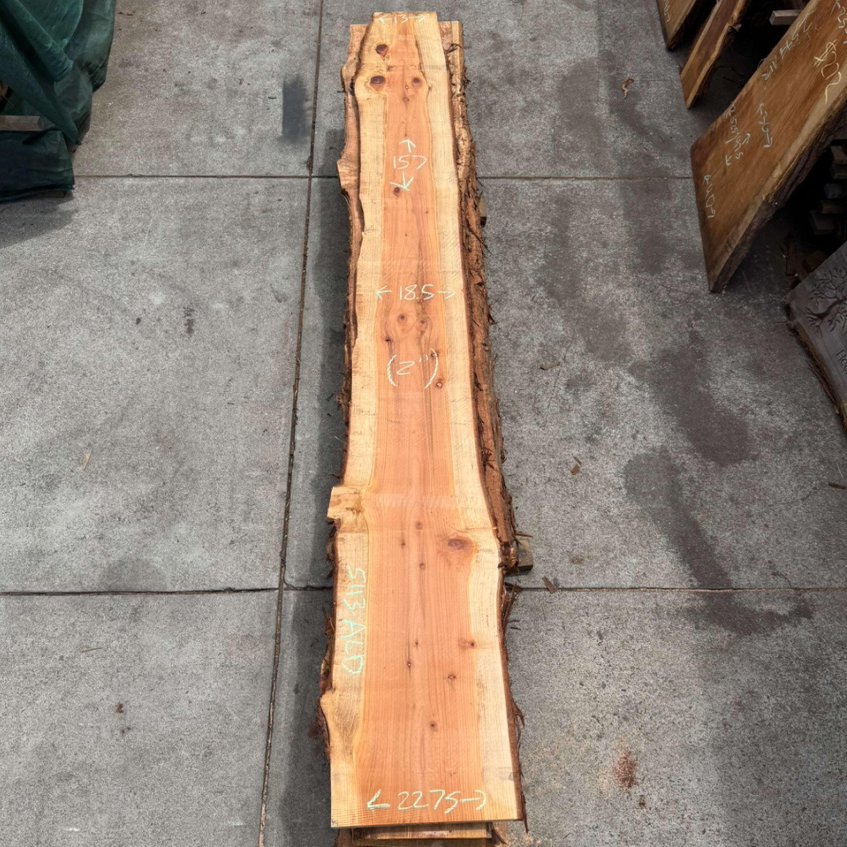 Redwood slab from Peroba Reclaimed measuring 2" thick x 13"-18.5"-22.75" wide x 157" long
