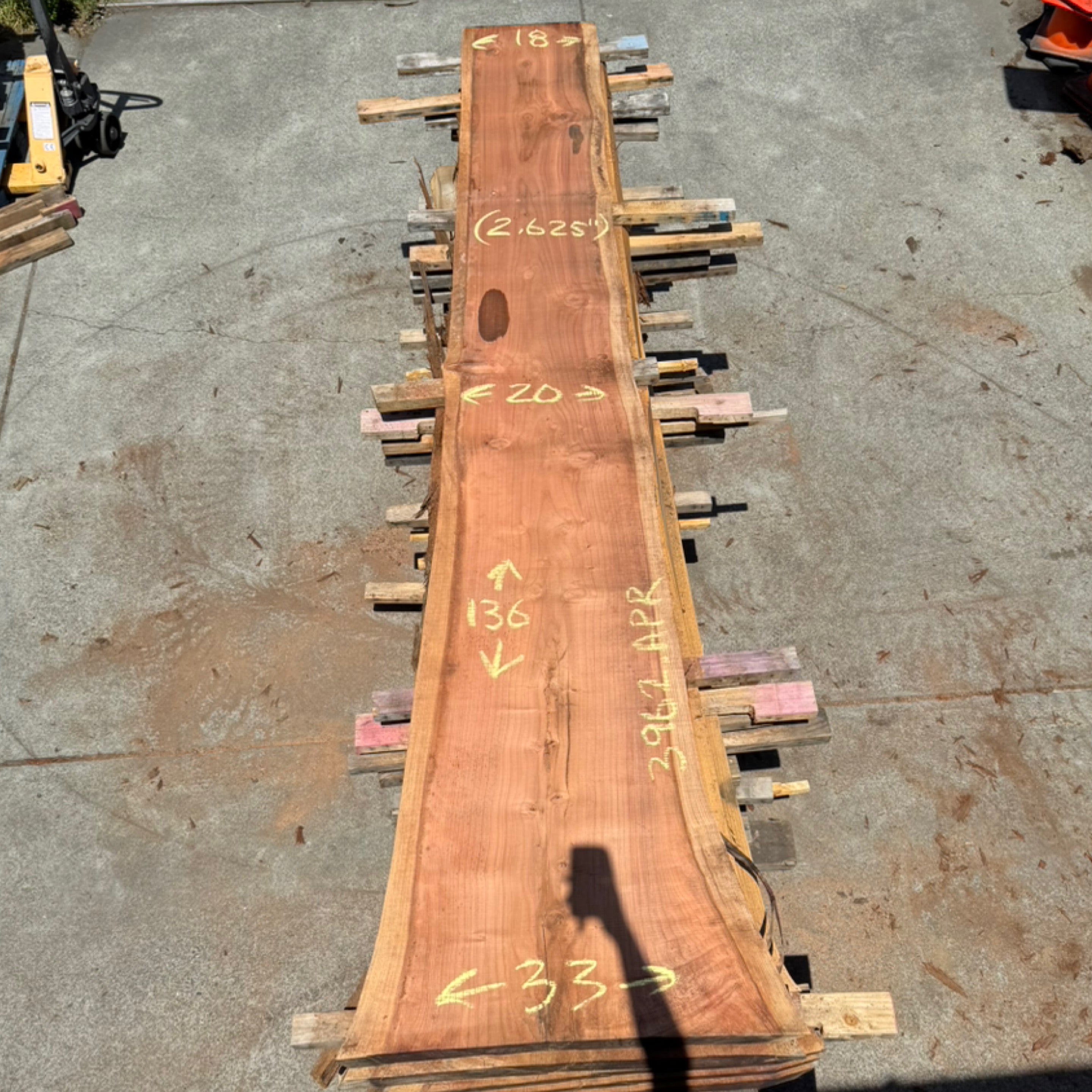 Redwood slab from Peroba Reclaimed measuring 2.625" thick x 18"-20"-33" wide x 136" long