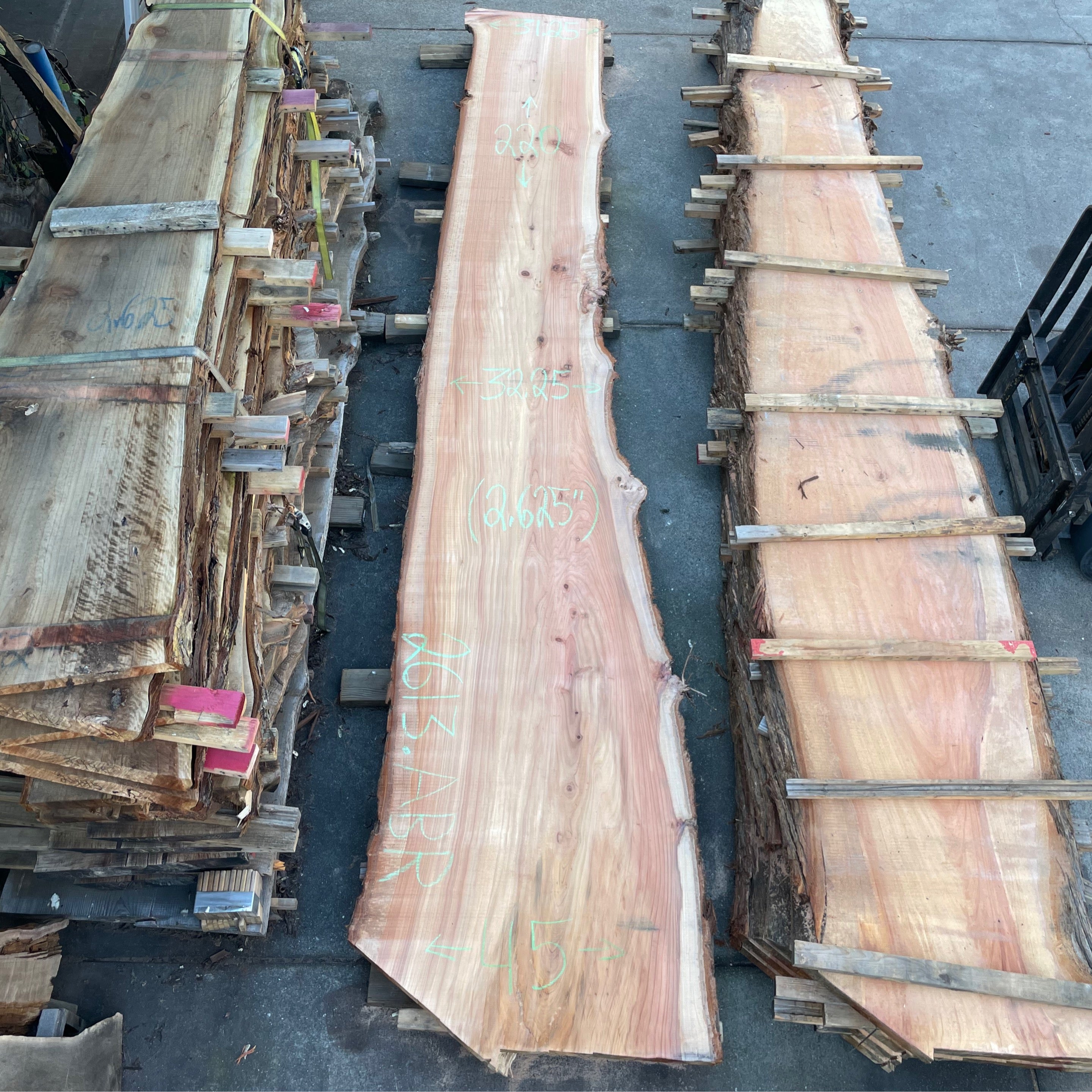 Redwood slab from Peroba Reclaimed measuring 2.625" thick x 25.25"-34.5"-44.5" wide x 220" long