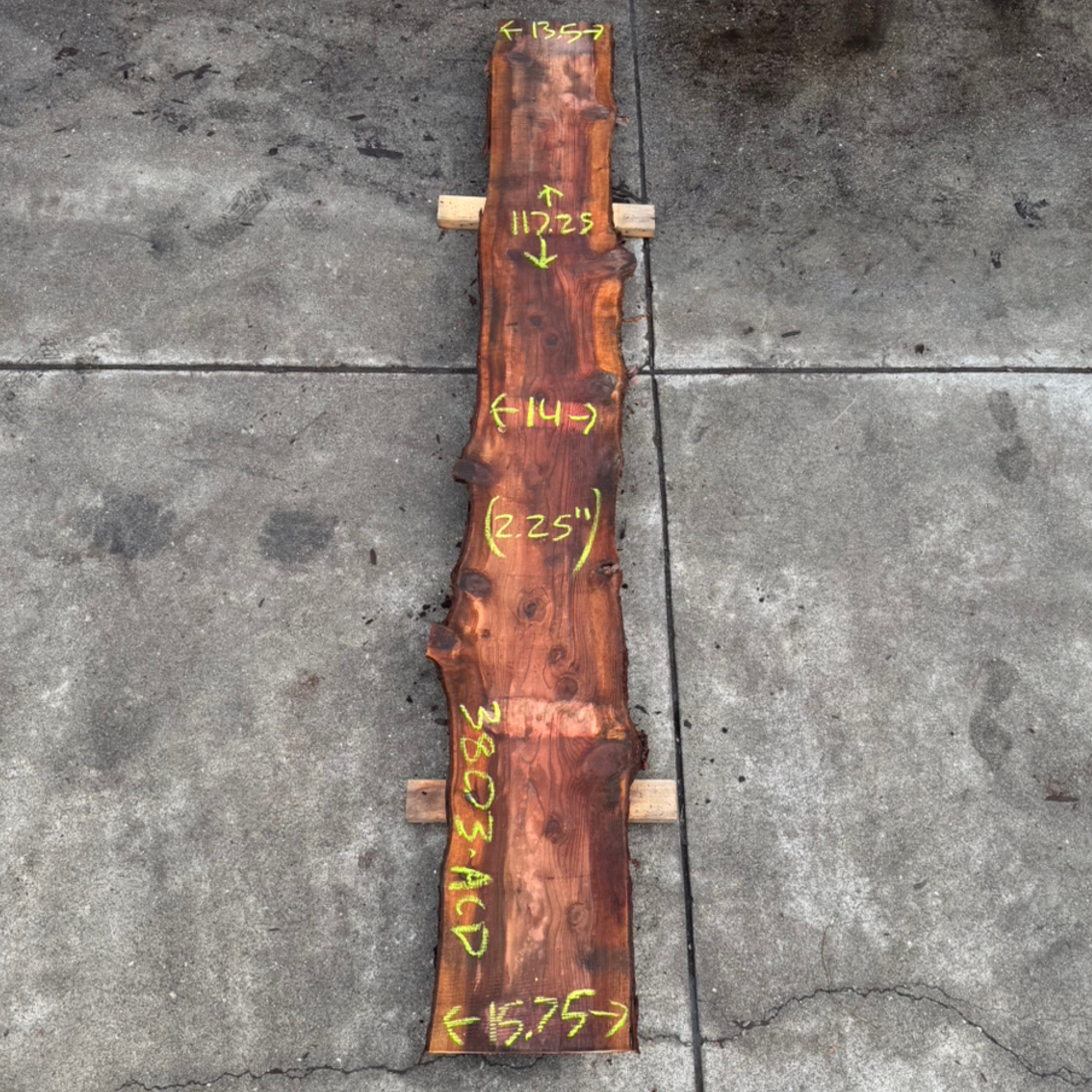 Giant Sequoia slab from Peroba Reclaimed measuring 2.25" thick x 13.5"-14"-15.75" wide x 117.25" long