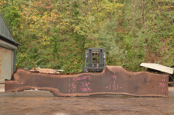 Black Walnut slab from Goby Walnut measuring 3.25" thick x 32"-44"-34" wide x 151" long