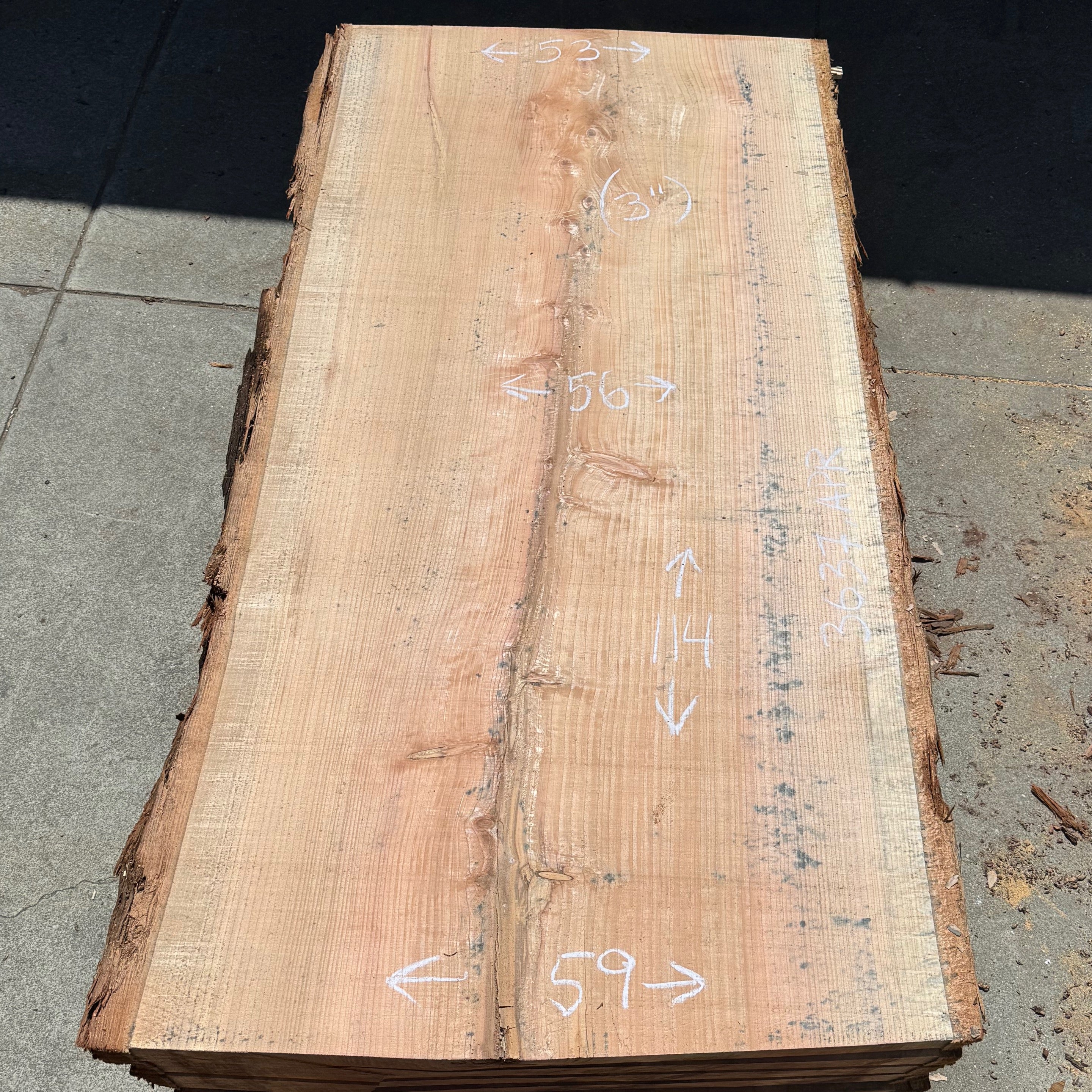 Redwood slab from Peroba Reclaimed measuring 3" thick x 53"-56"-59" wide x 114" long