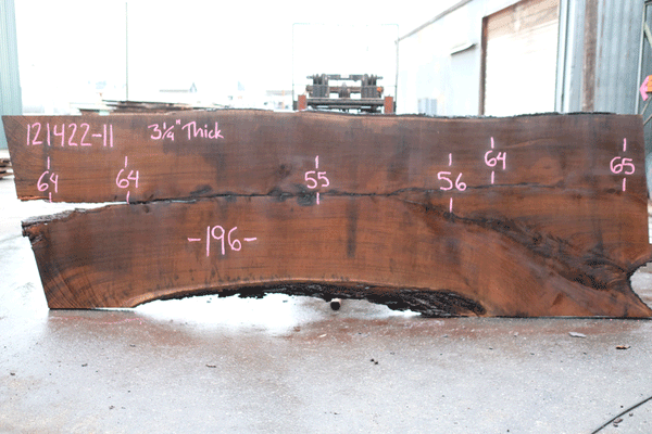 Black Walnut slab from Goby Walnut measuring 3.25" thick x 64"-64"-55"-56"-64"-65" wide x 196" long