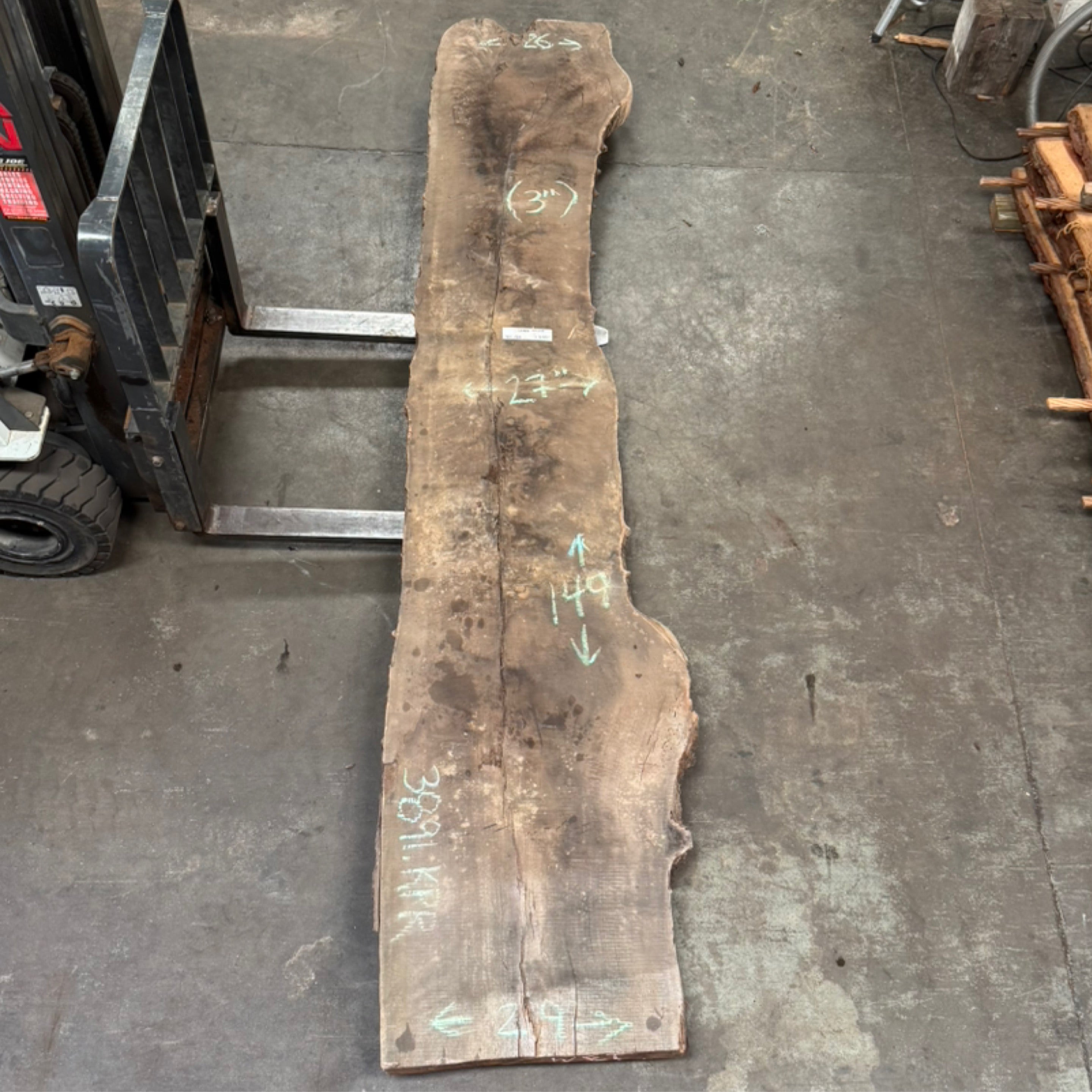 Claro Walnut slab from Peroba Reclaimed measuring 3" thick x 26"-27"-29" wide x 149" long