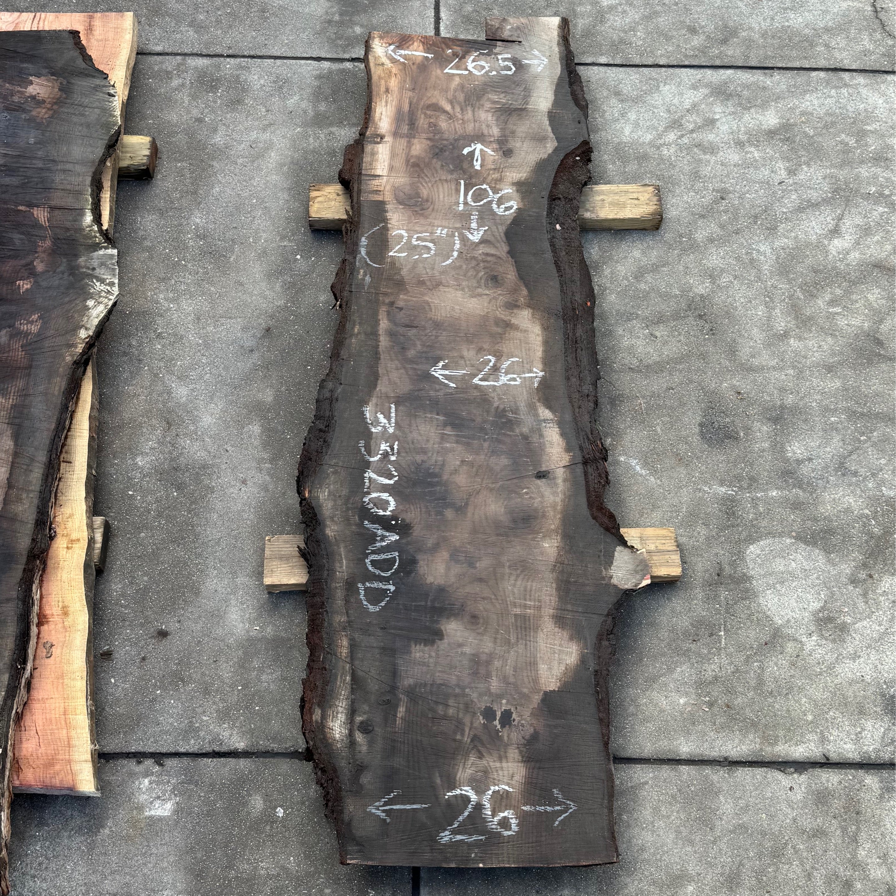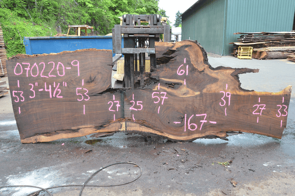 Black Walnut slab from Goby Walnut measuring 4"-4.25" thick x 108"-95"-80"-98" wide x 153" long