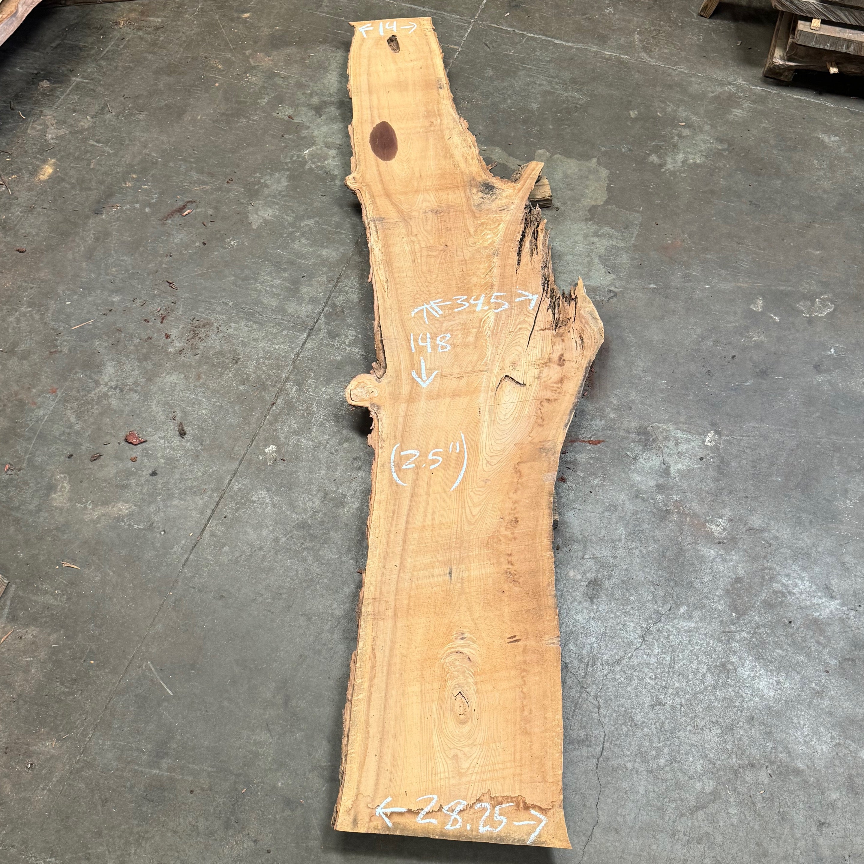 Elm slab from Peroba Reclaimed measuring 2.5" thick x 14"-34.5"-28.25" wide x 148" long