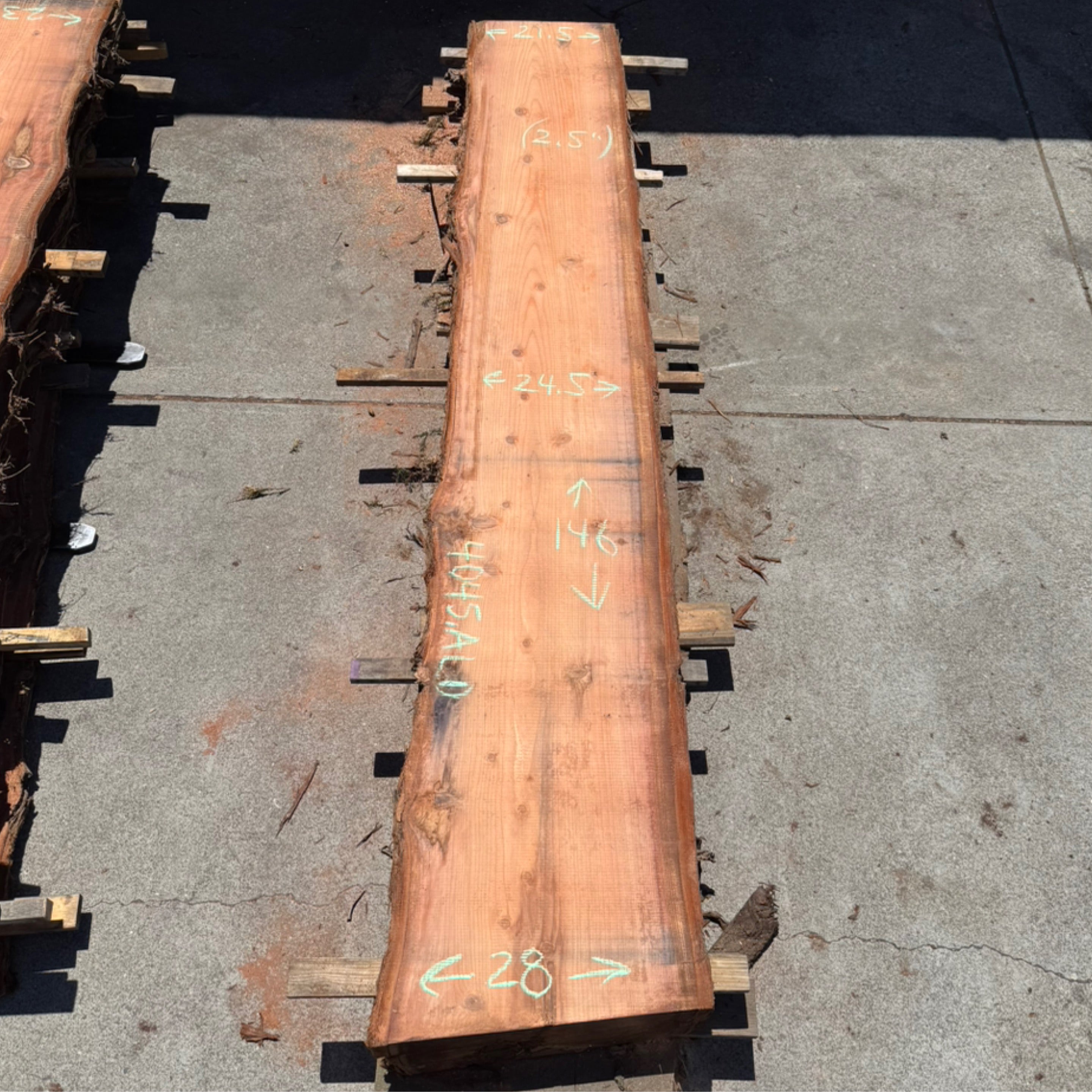 Redwood slab from Peroba Reclaimed measuring 2.5" thick x 21.5"-24.5"-28" wide x 146" long