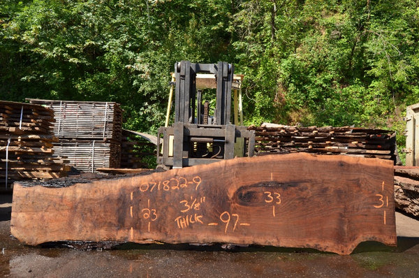 Black Walnut slab from Goby Walnut measuring 2.75"-4" thick x 22"-31"-32"-38"-38" wide x 176" long