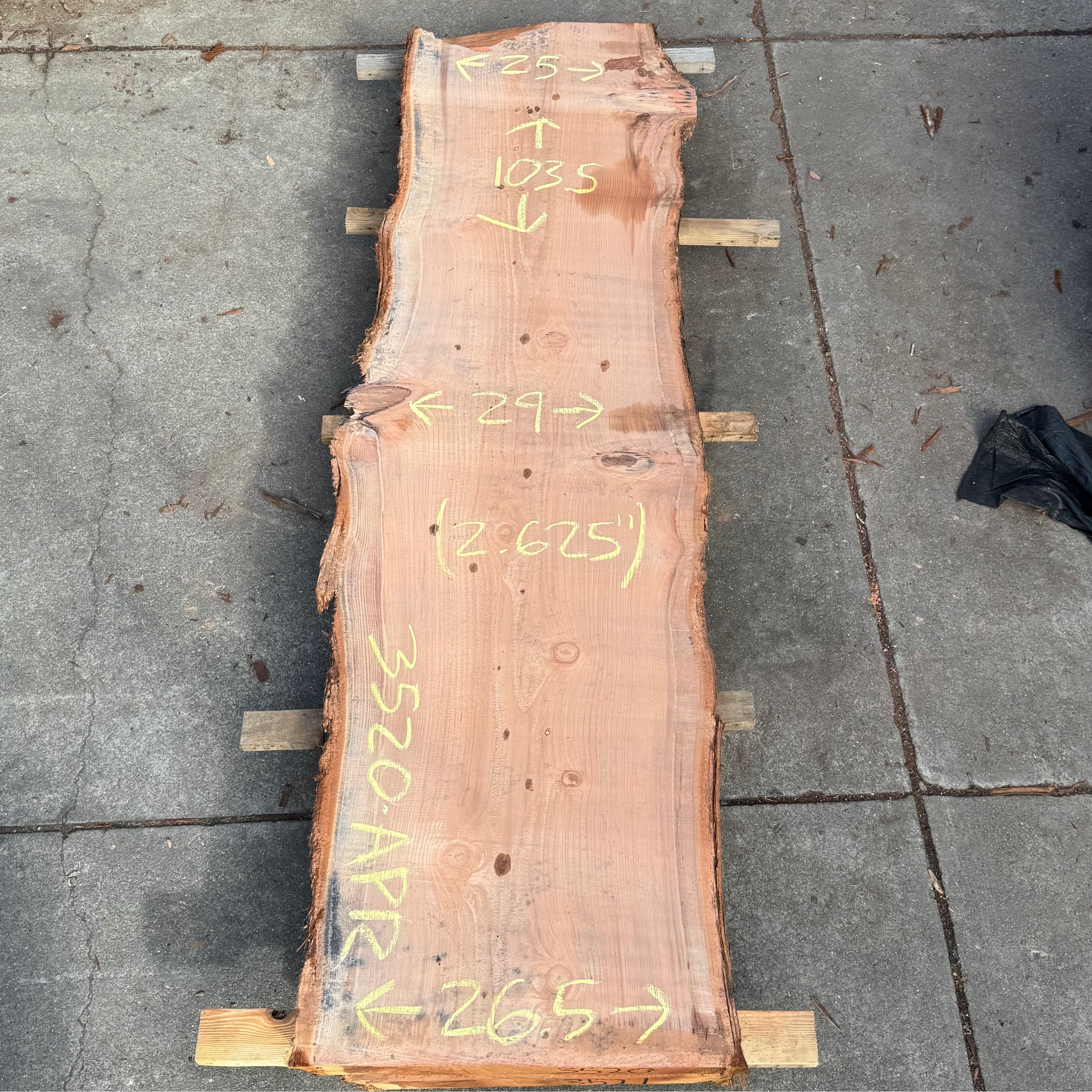Redwood slab from Peroba Reclaimed measuring 2.625" thick x 25"-29"-26.5" wide x 103.5" long