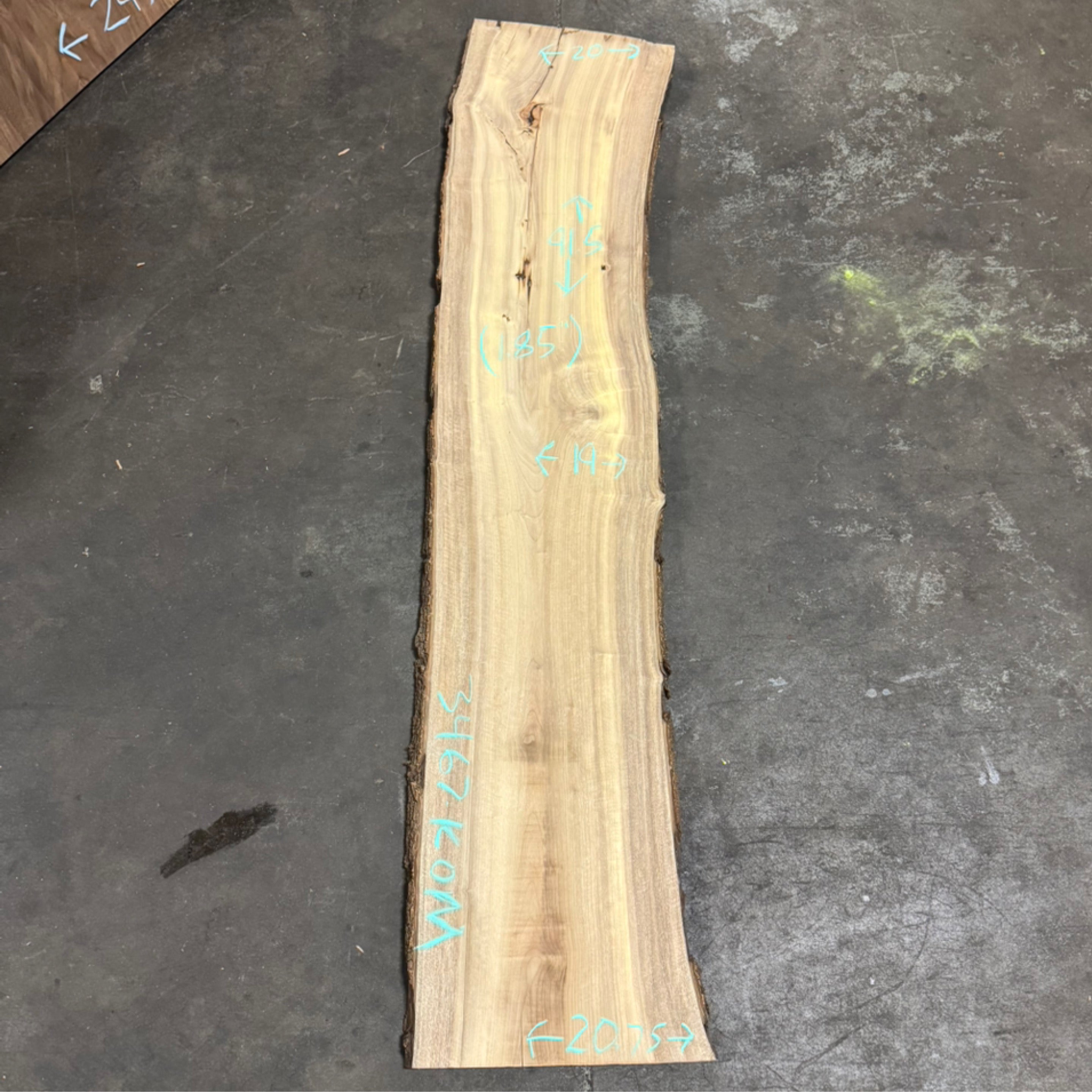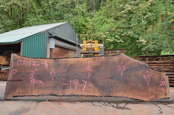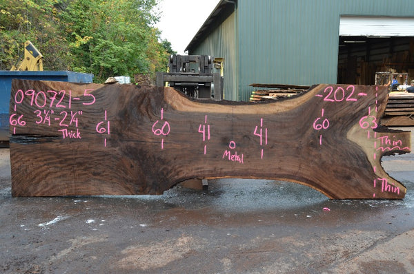 Black Walnut slab from Goby Walnut measuring 2.25"-3.25" thick x 66"-61"-60"-41"-41"-60"-63" wide x 202" long