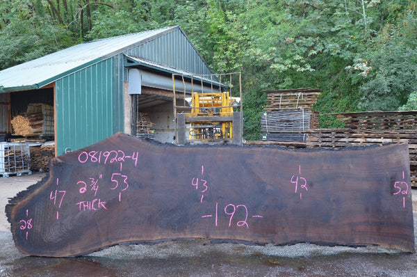 Black Walnut slab from Goby Walnut measuring 2.75" thick x 28"-47"-53"-43"-42"-52" wide x 192" long