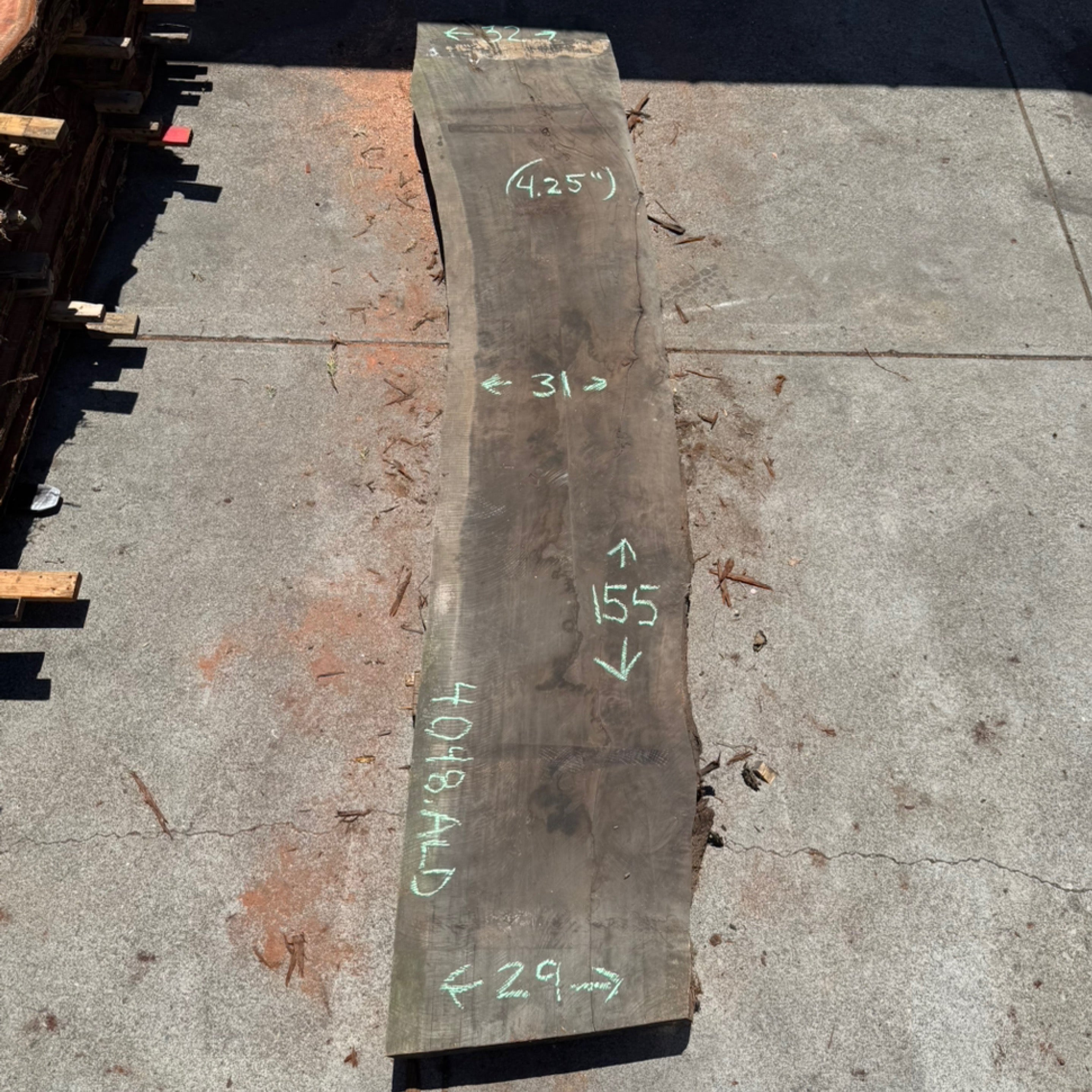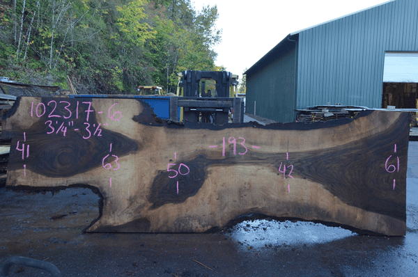 Black Walnut slab from Goby Walnut measuring 3.5"-3.25" thick x 41"-63"-50"-42"-61" wide x 193" long