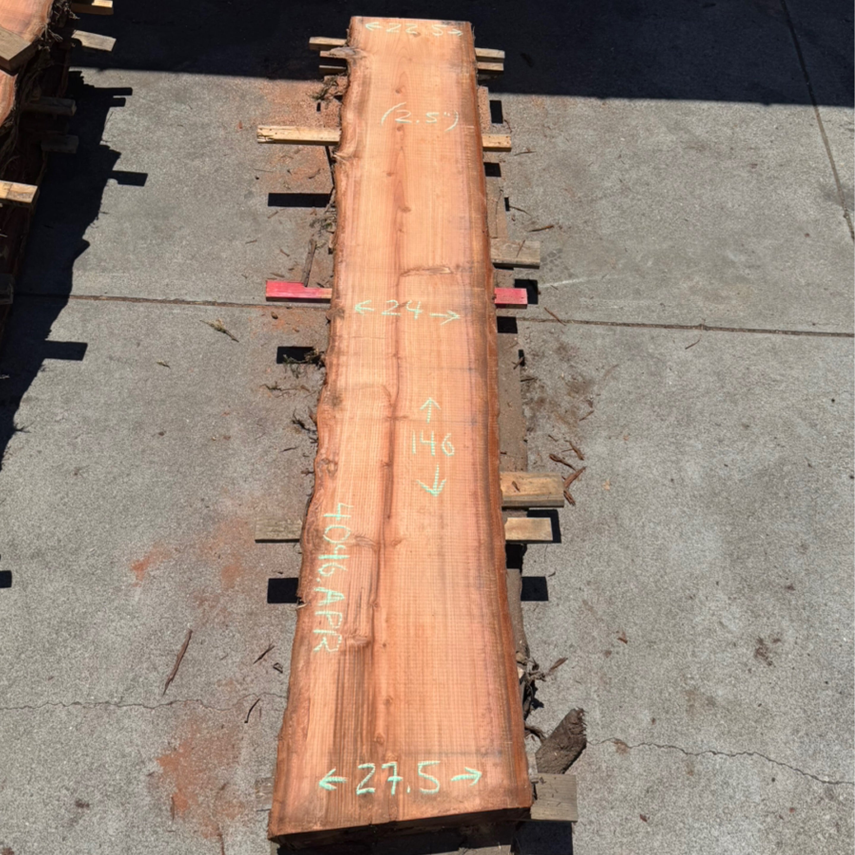 Redwood slab from Peroba Reclaimed measuring 2.5" thick x 22.5"-24"-27.5" wide x 146" long