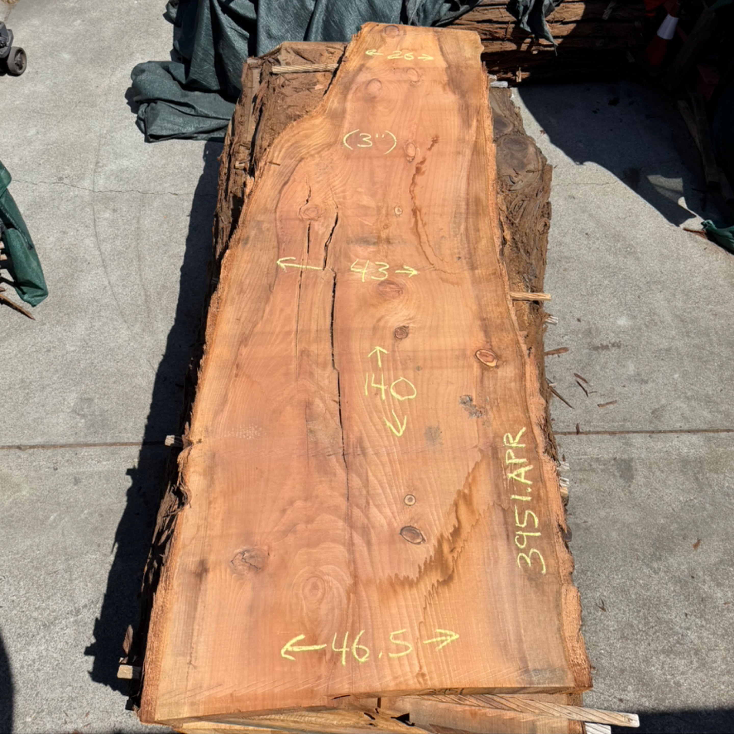 Redwood slab from Peroba Reclaimed measuring 3" thick x 26"-43"-46.5" wide x 140" long