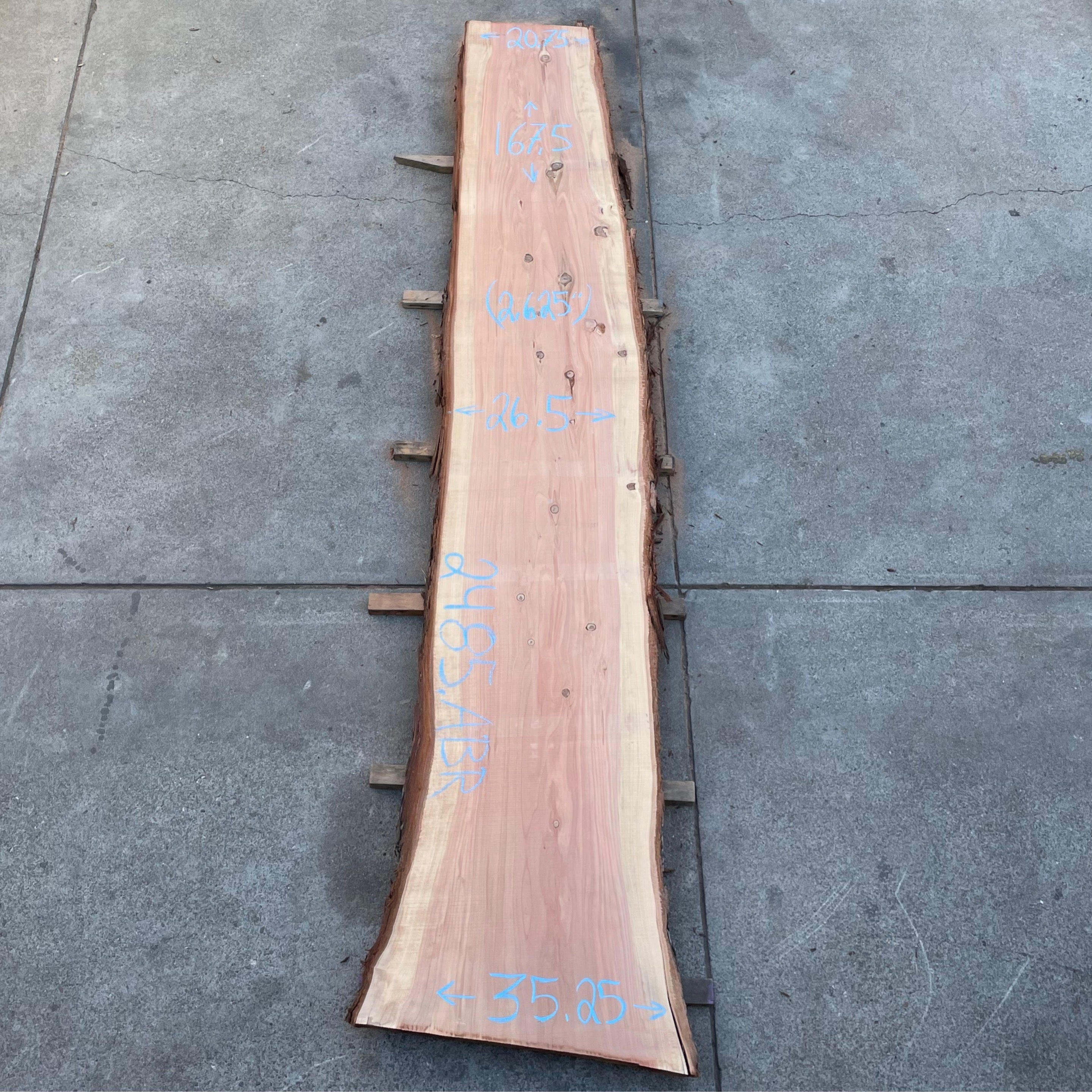 Redwood slab from Peroba Reclaimed measuring 2.625" thick x 20.75"-26.5"-35.25" wide x 167.5" long