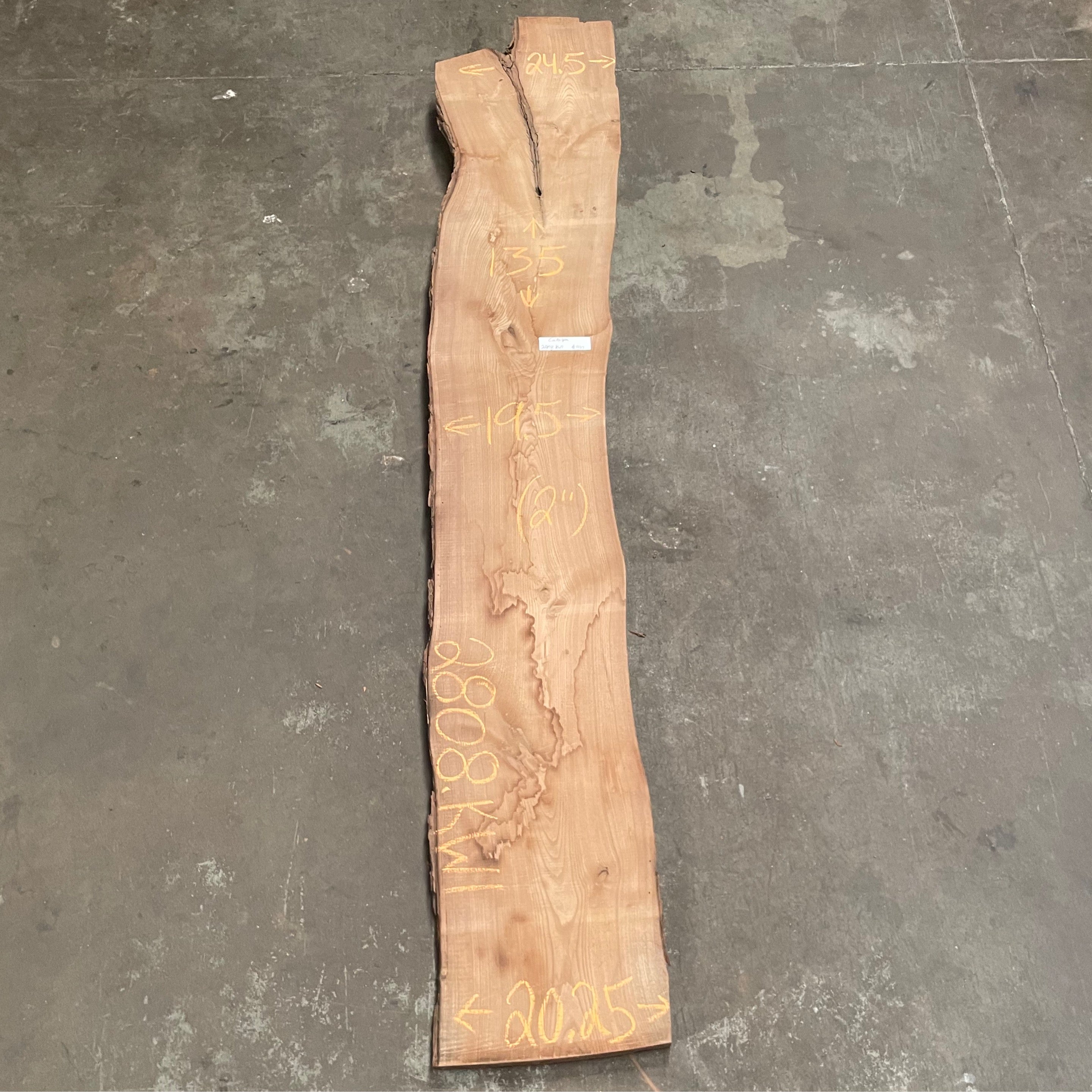 Catalpa slab from Peroba Reclaimed measuring 2" thick x 24.5"-19.5"-20.25" wide x 135" long
