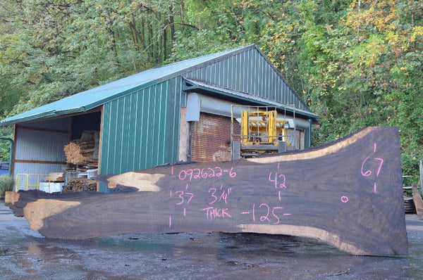 Black Walnut slab from Goby Walnut measuring 3.25" thick x 37"-42"-67" wide x 125" long