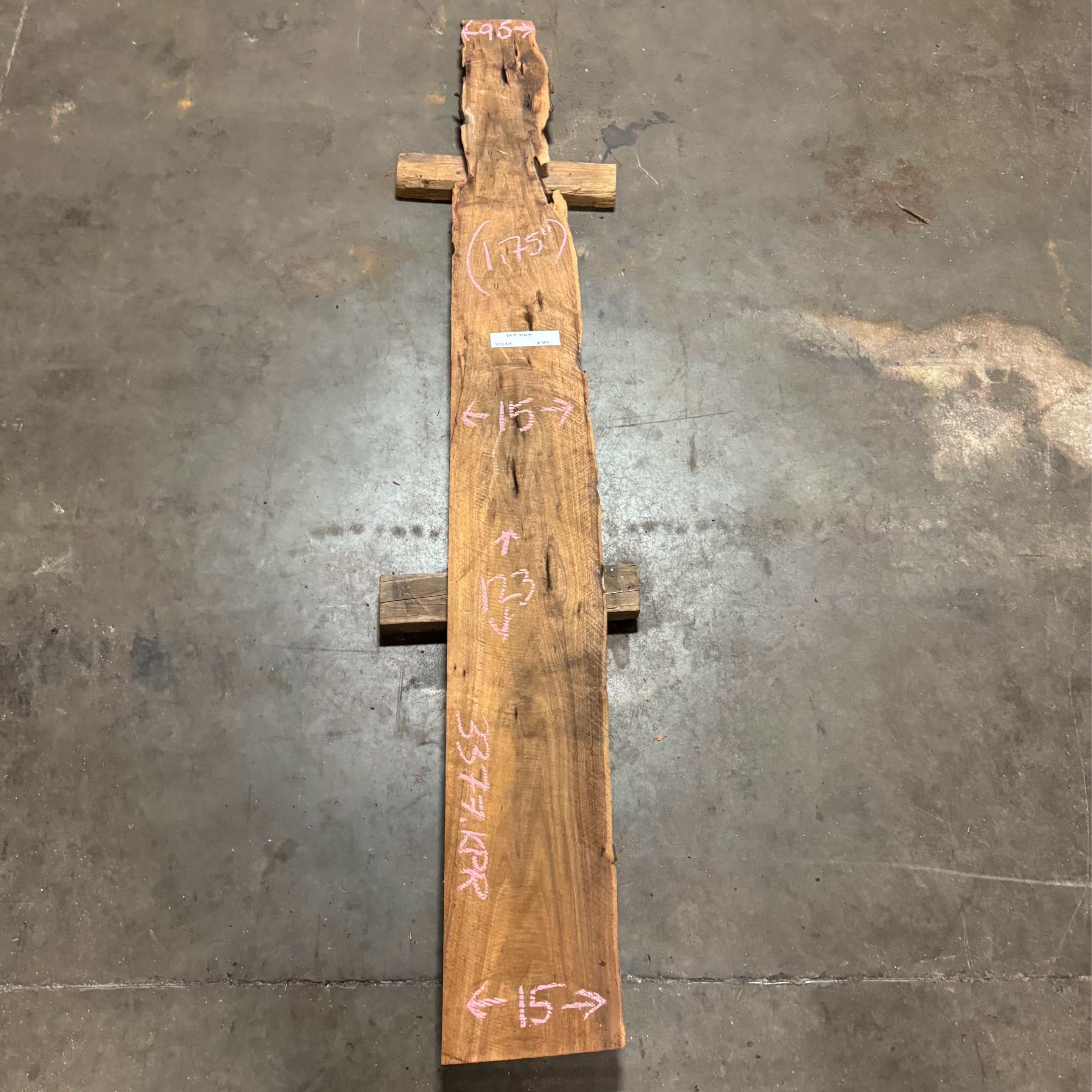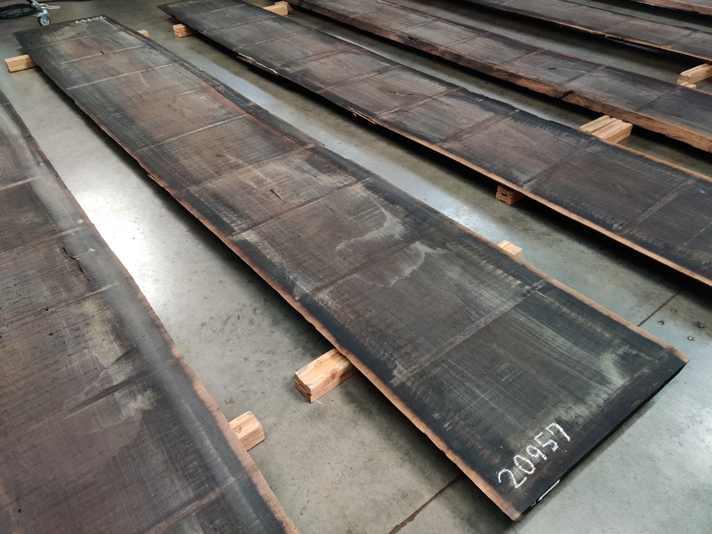Black Acacia slab from Peroba Reclaimed measuring 1.75" thick x 9.5"-15"-15" wide x 123" long