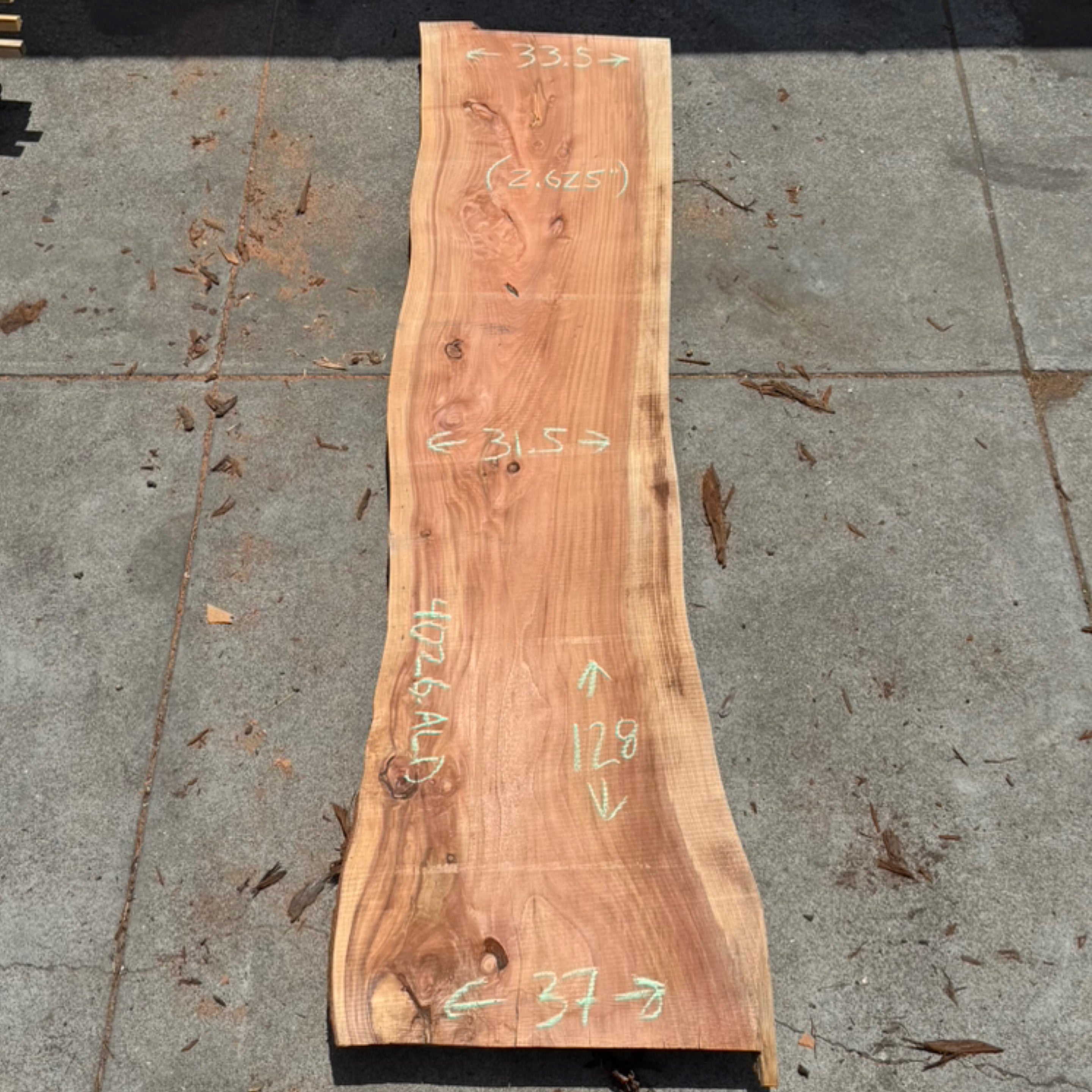 Redwood slab from Peroba Reclaimed measuring 2.625" thick x 33.5"-31.5"-37" wide x 128" long