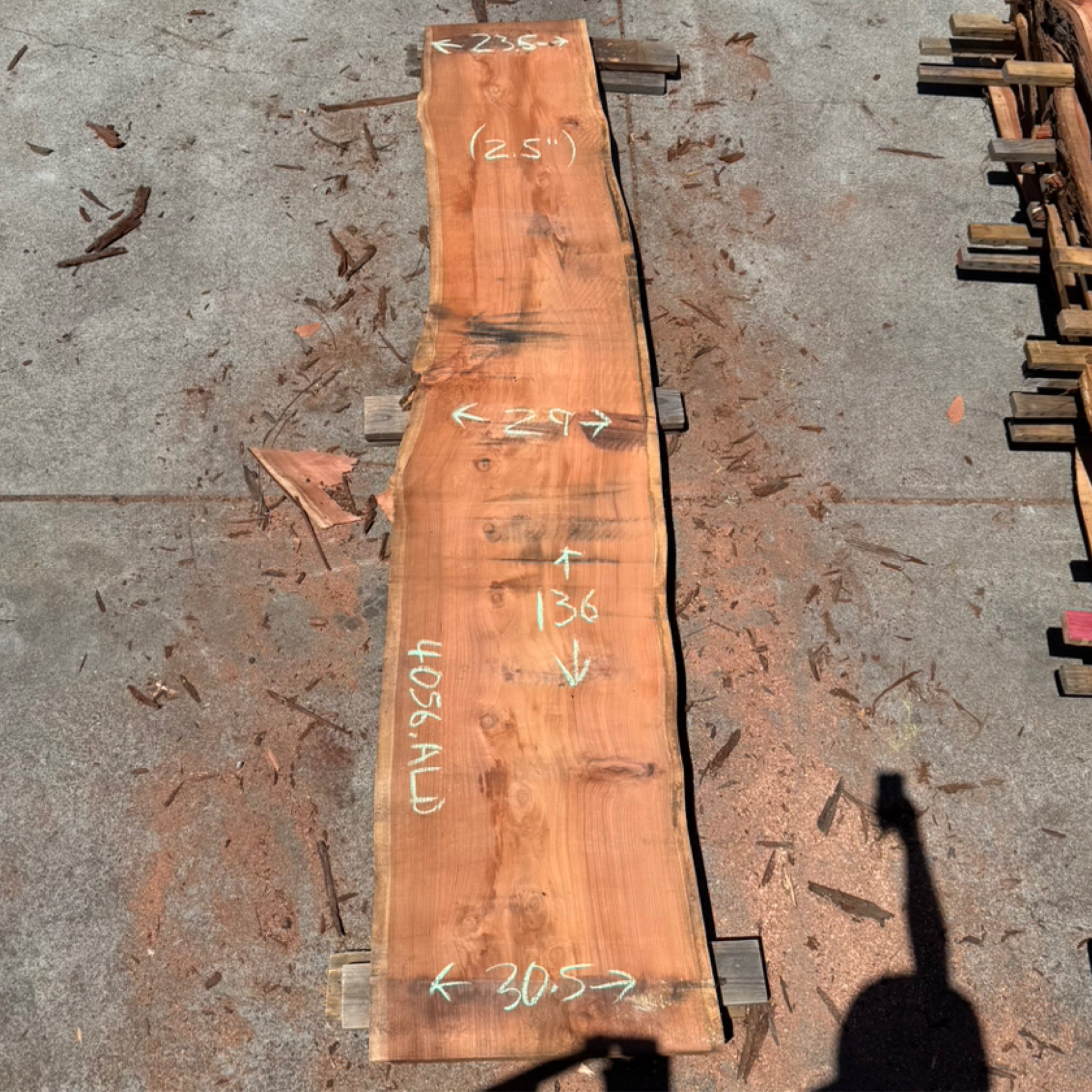 Redwood slab from Peroba Reclaimed measuring 2.5" thick x 23.5"-29"-30.5" wide x 136" long