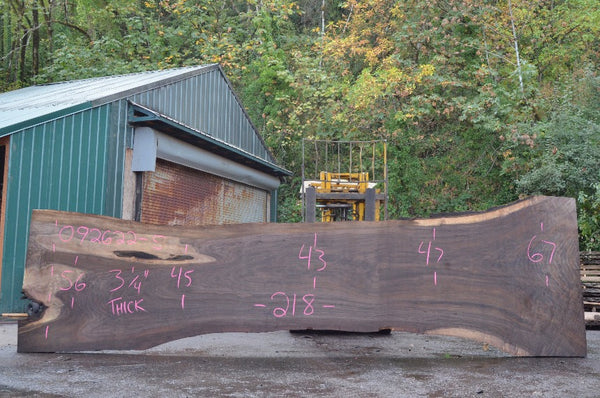 Black Walnut slab from Goby Walnut measuring 3.25" thick x 56"-45"-43"-47"-67" wide x 218" long