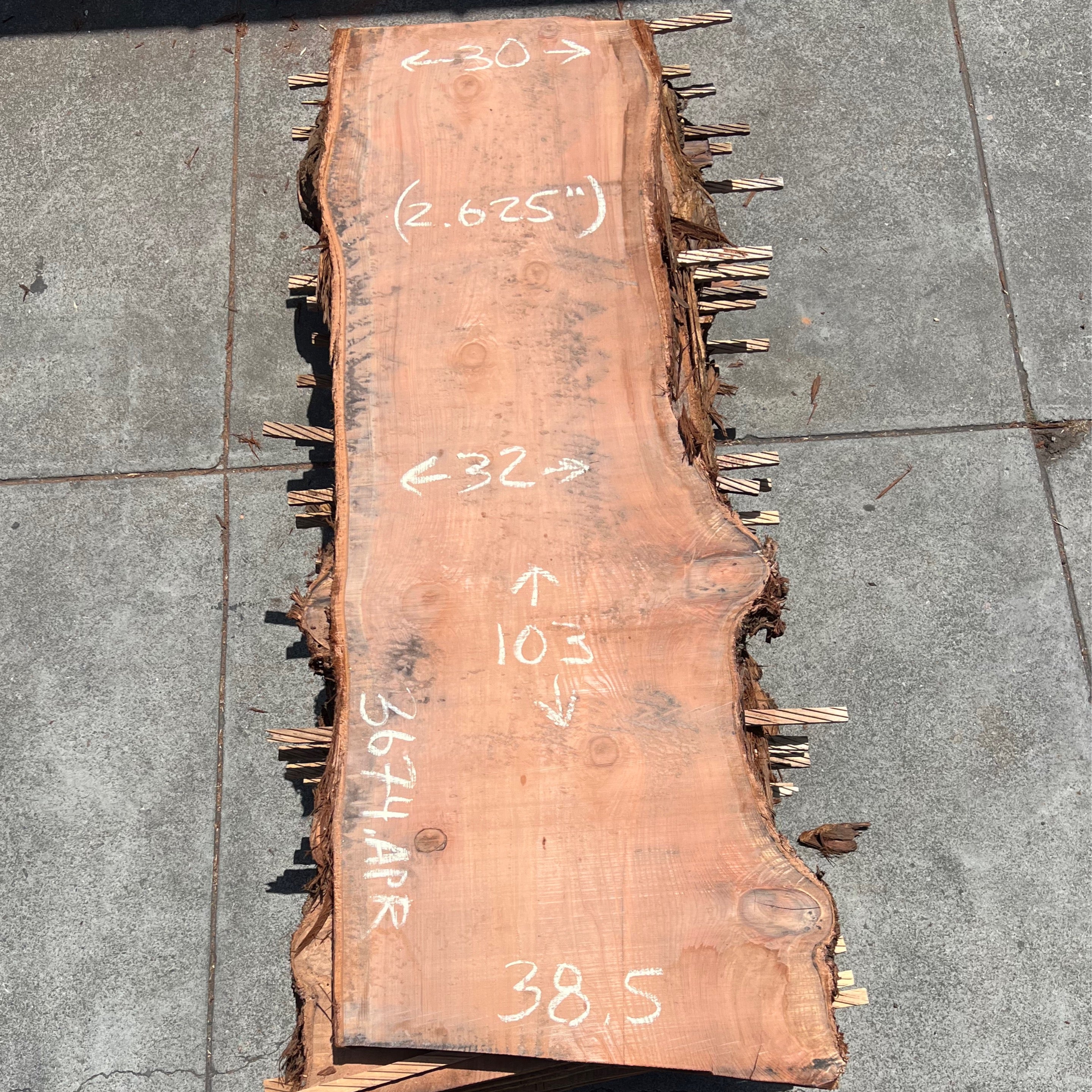 Redwood slab from Peroba Reclaimed measuring 2.625" thick x 30"-32"-38.5" wide x 103" long