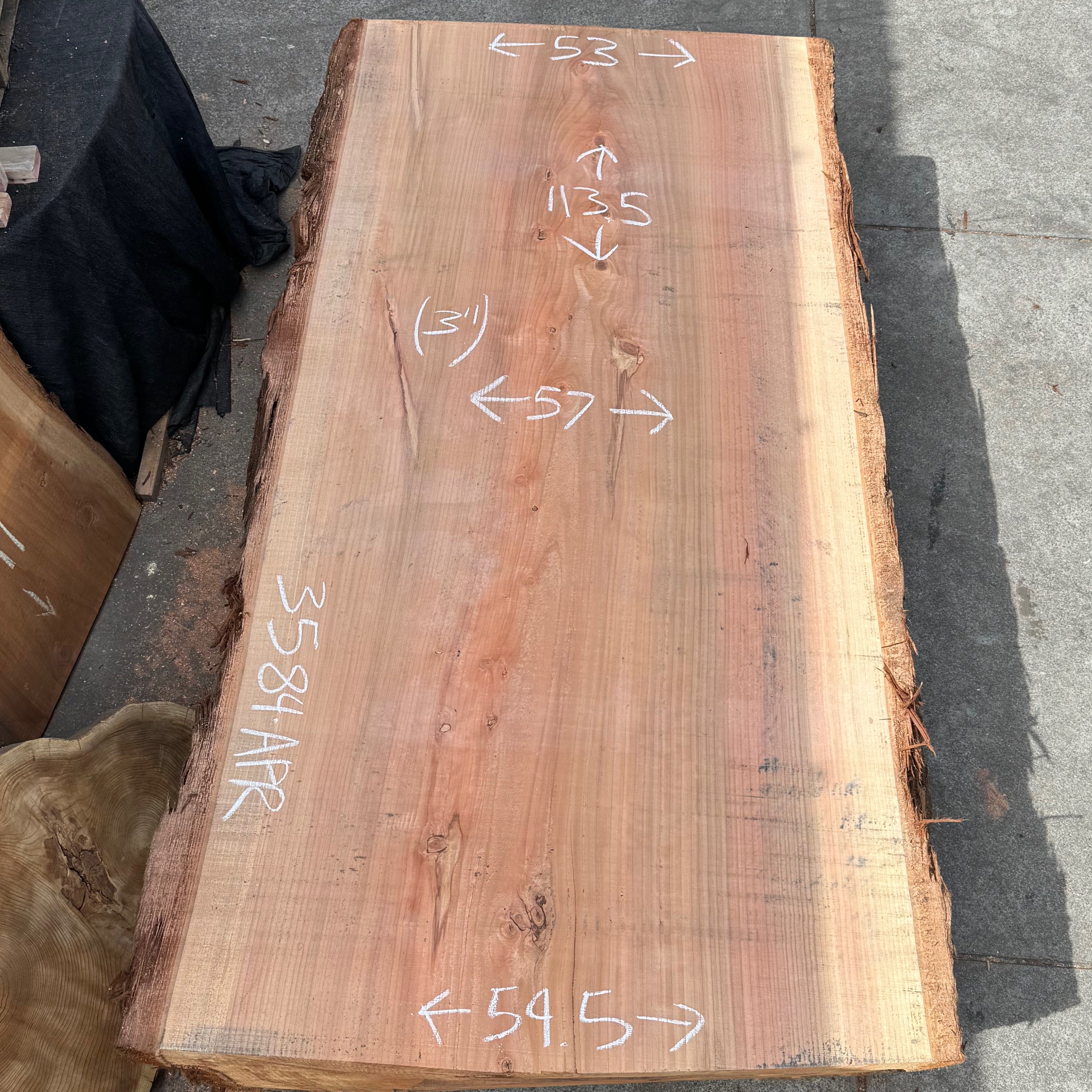 Redwood slab from Peroba Reclaimed measuring 3" thick x 53"-57"-59.5" wide x 113.5" long
