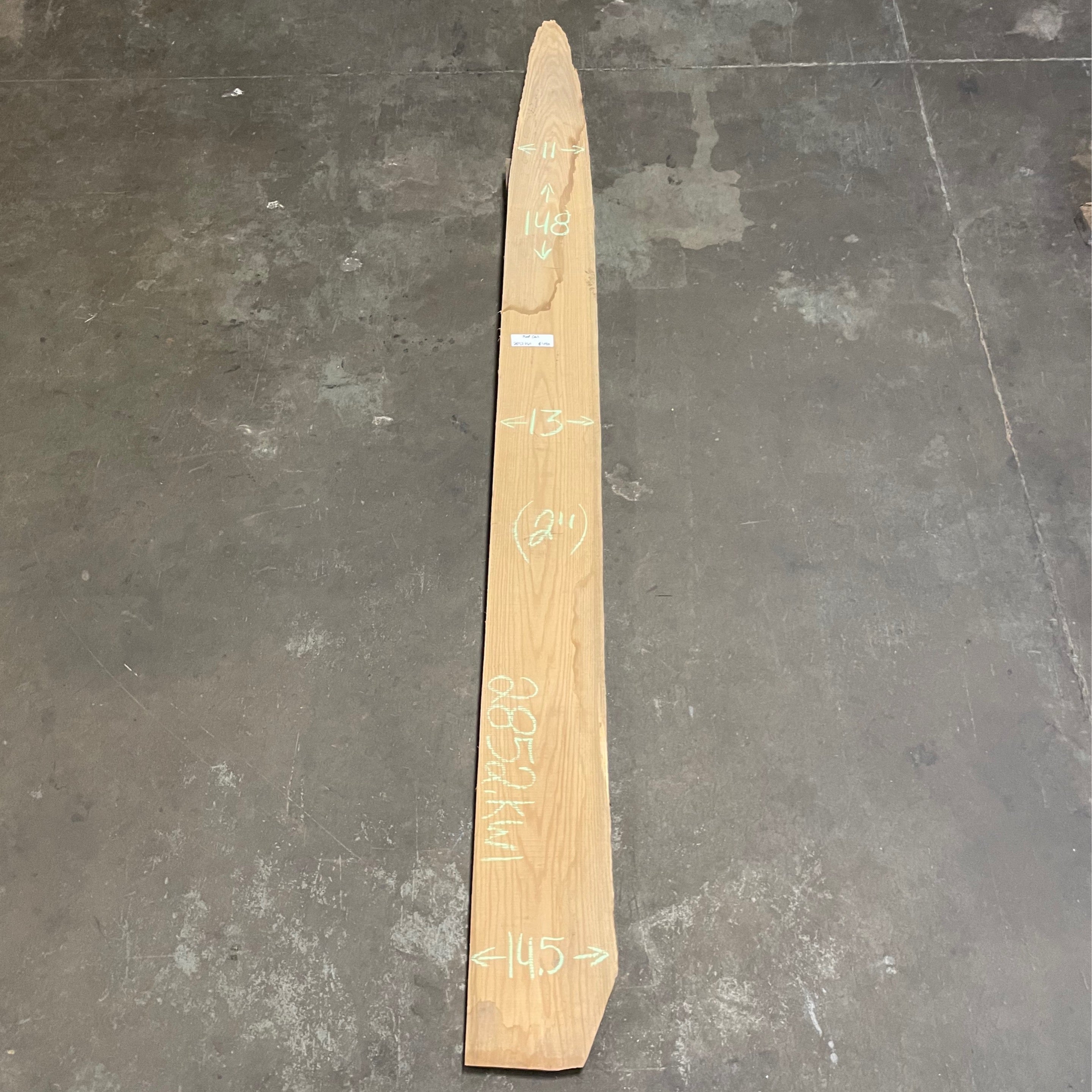 Red Oak slab from Peroba Reclaimed measuring 2" thick x 11"-13"-14.5" wide x 148" long