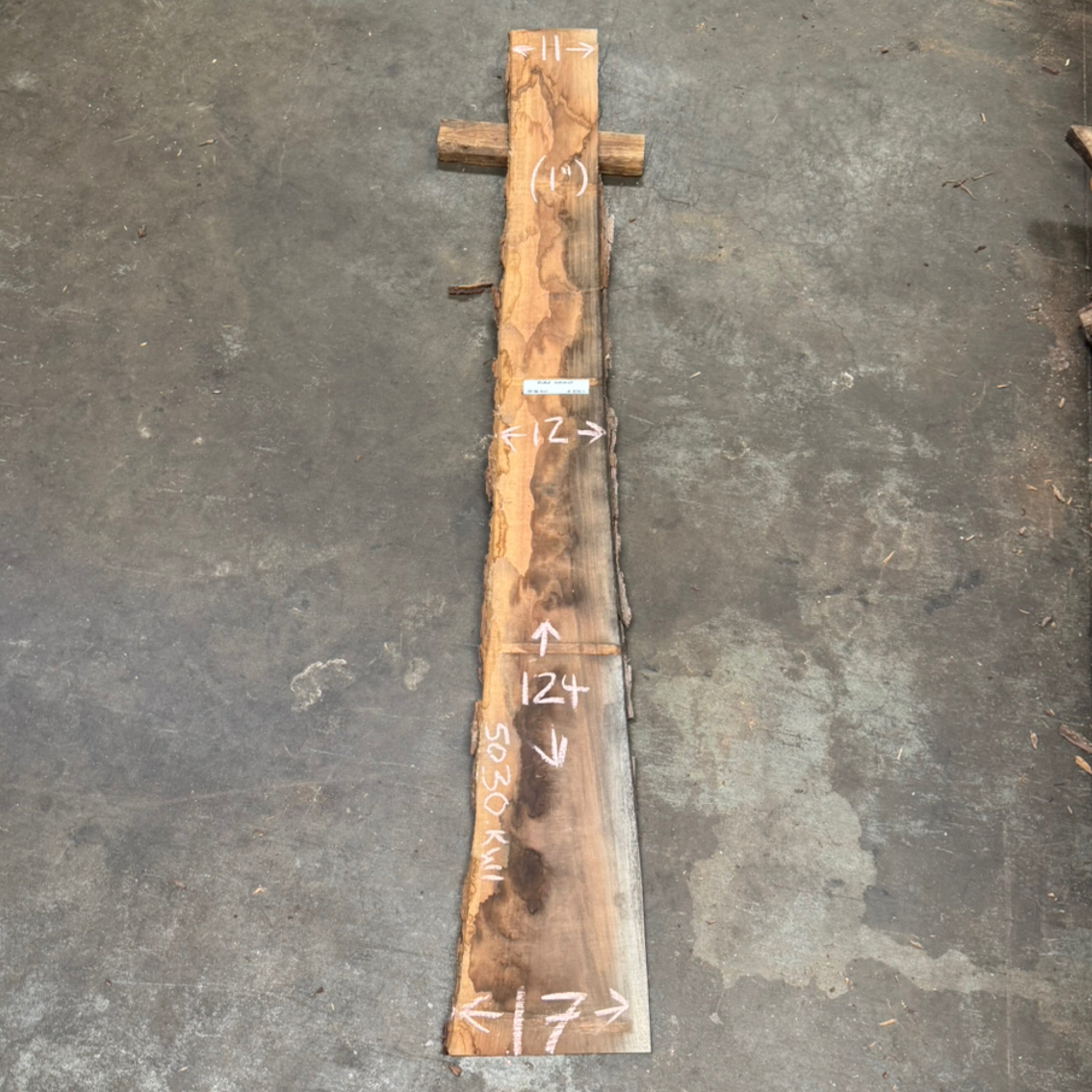 Black Walnut slab from Peroba Reclaimed measuring 1" thick x 11"-12"-17" wide x 124" long