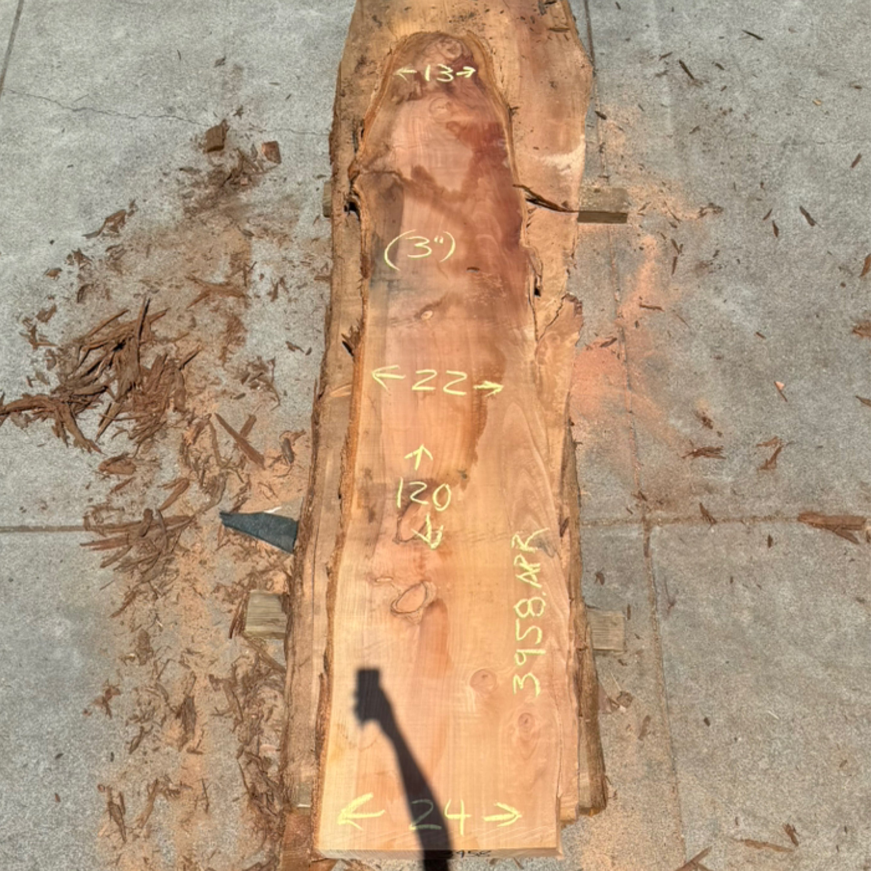 Cedar slab from Peroba Reclaimed measuring 3" thick x 22.5"-28"-39" wide x 177" long