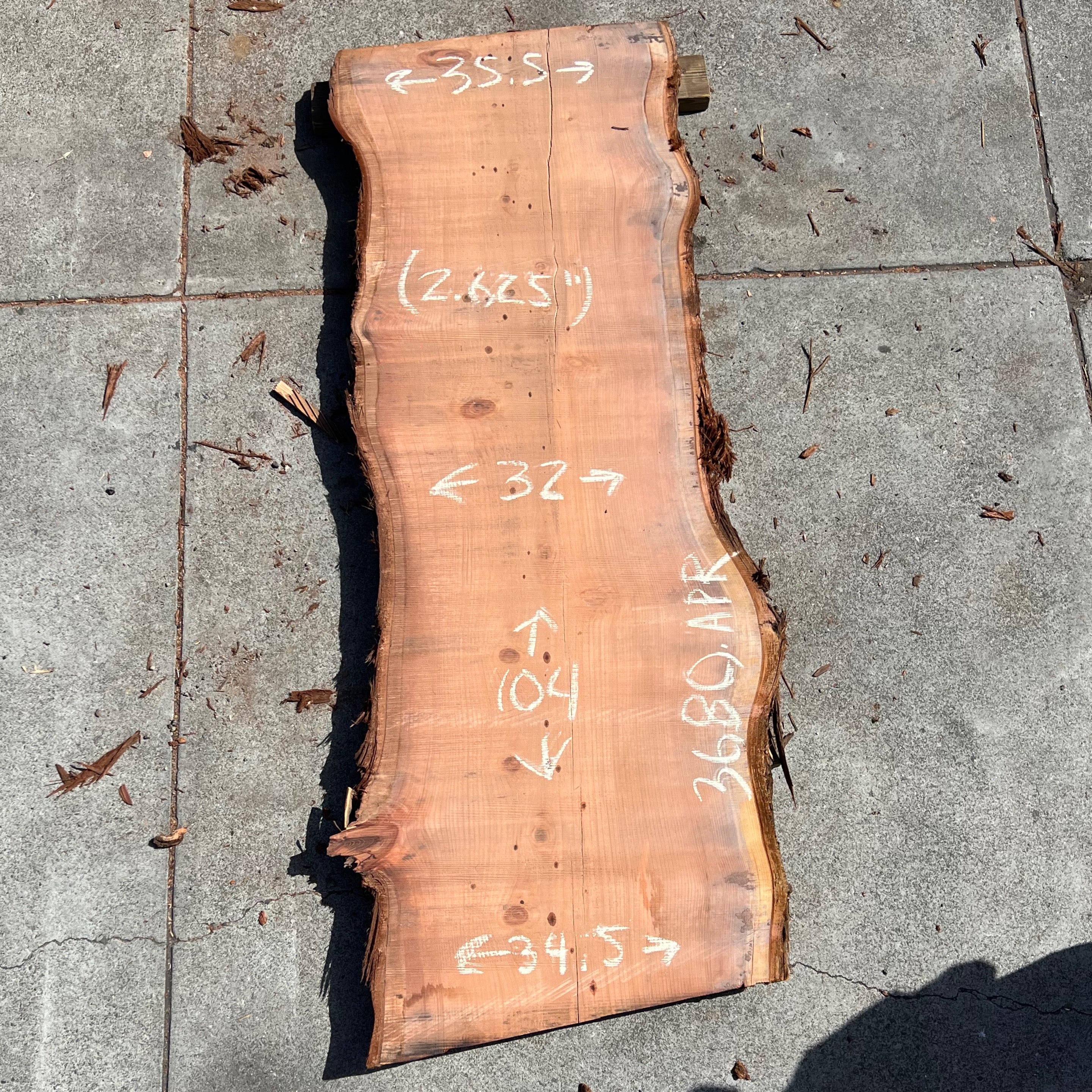 Redwood slab from Peroba Reclaimed measuring 2.625" thick x 35.5"-32"-34.5" wide x 104" long