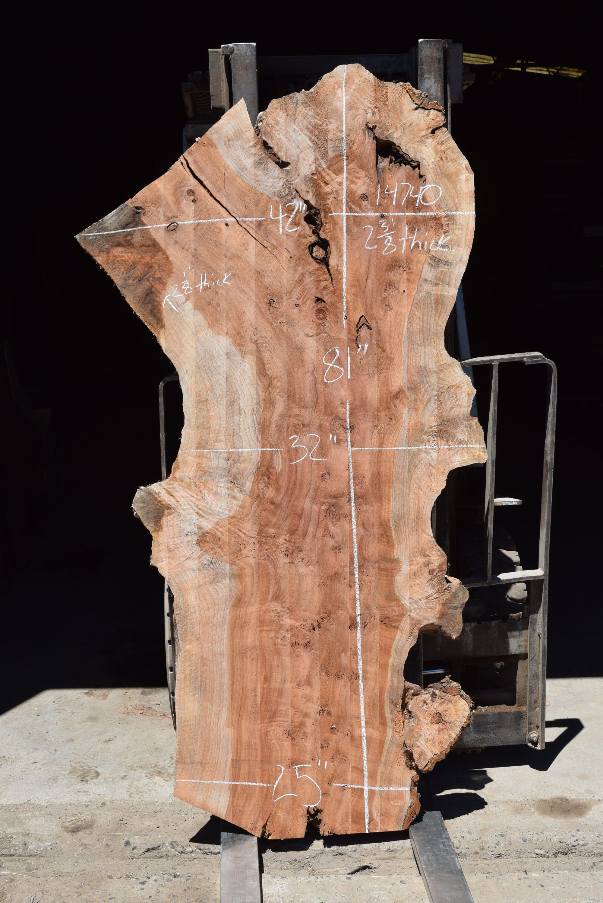 Redwood slab from Berkshire Products measuring 2-3/8" thick x 32"-39"-47" wide x 10' 3" long