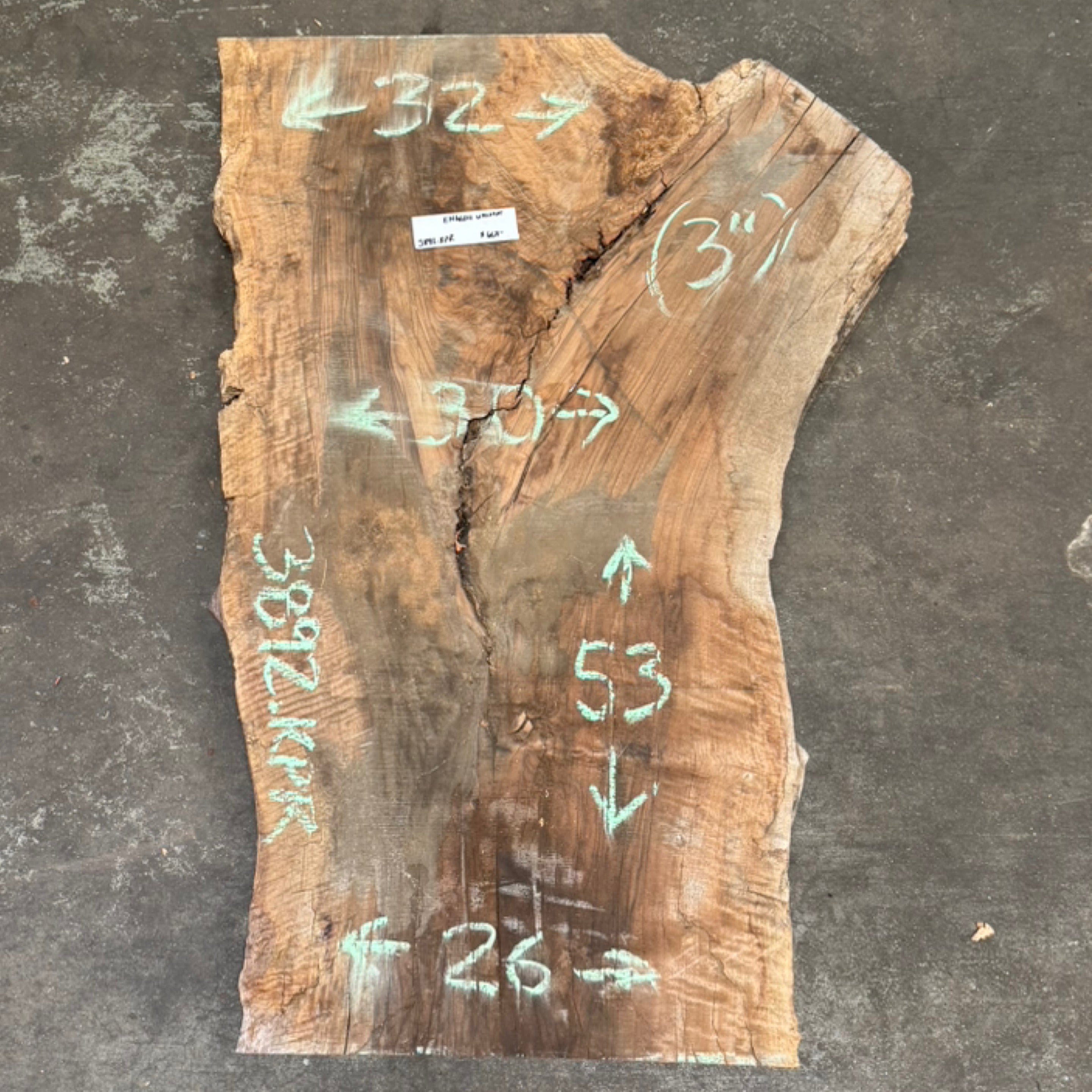 English Walnut slab from Peroba Reclaimed measuring 3" thick x 32"-30"-26" wide x 53" long