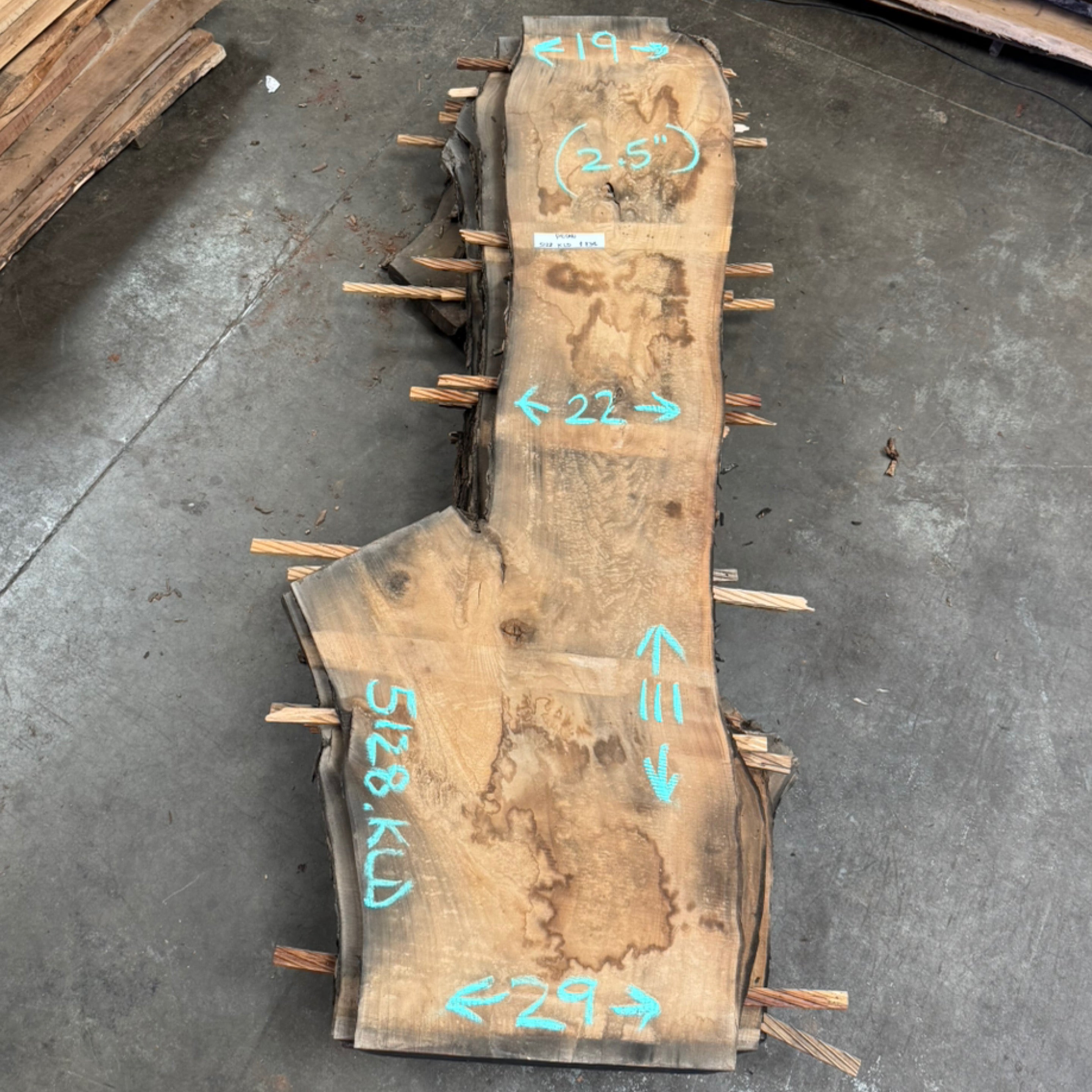 Maple slab from Goby Walnut measuring 3.25" thick x 52"-49"-44"-47"-40" wide x 189" long