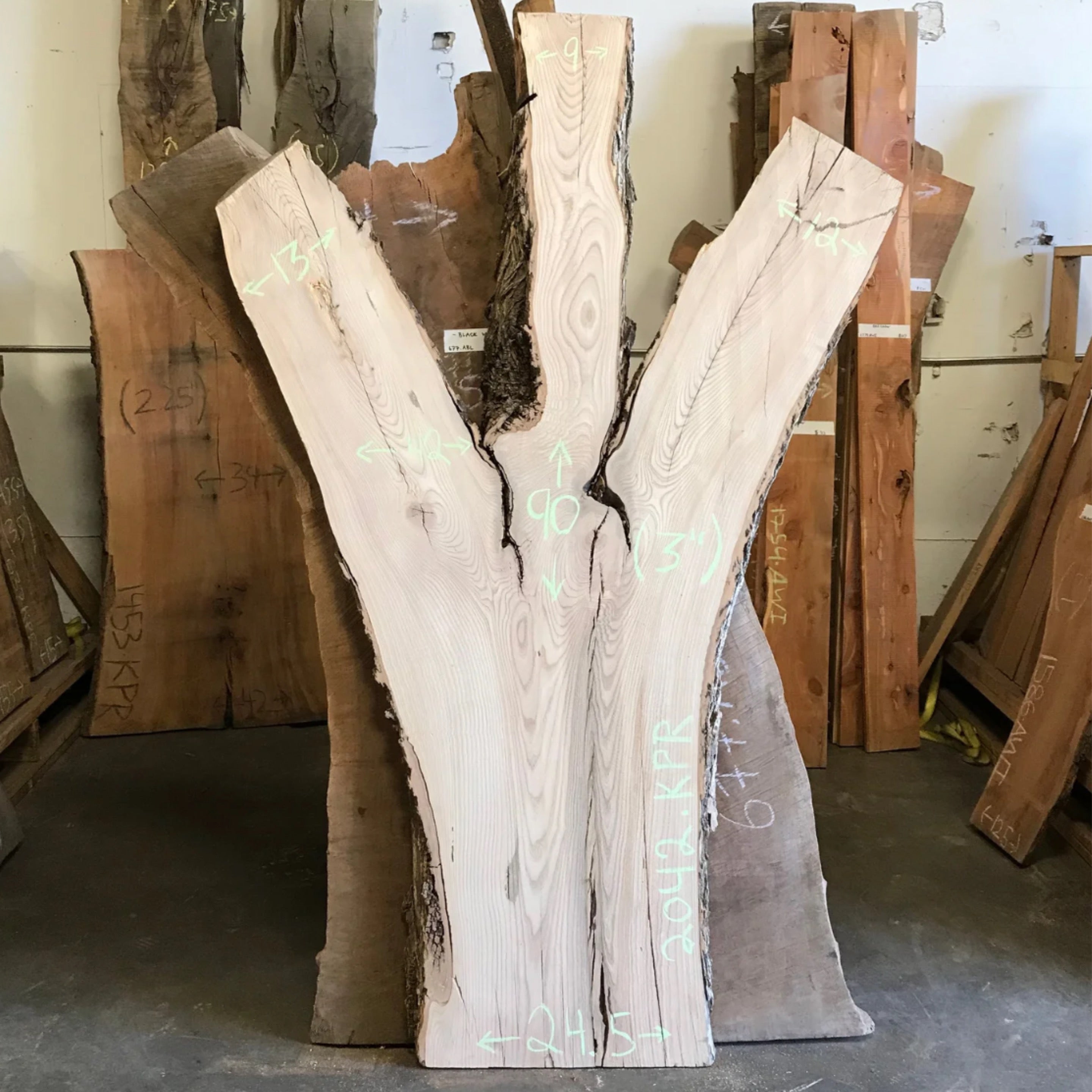 Ash slab from Peroba Reclaimed measuring 3" thick x 24.5"-42"-13"-9"-12" wide x 90" long