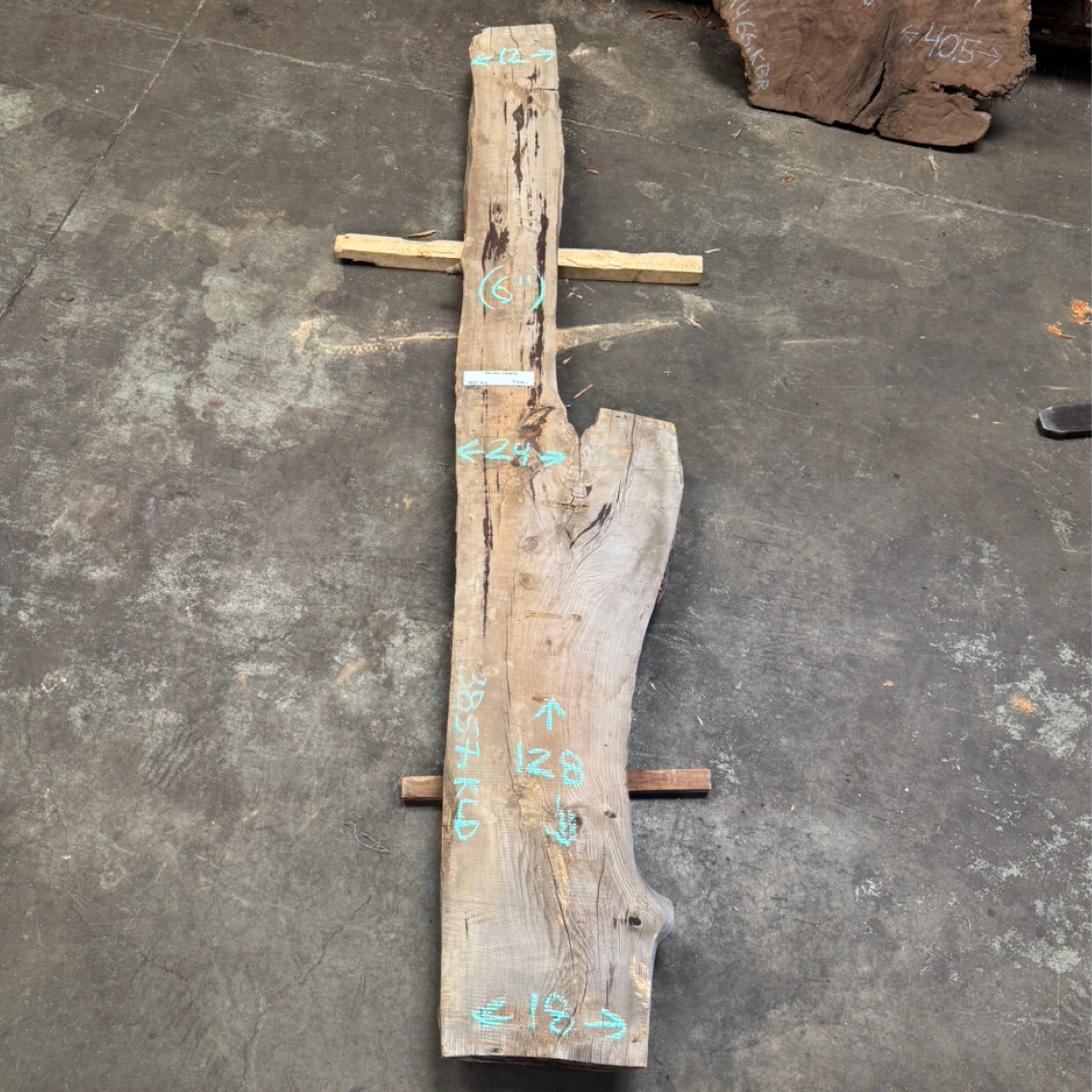 Cypress slab from Peroba Reclaimed measuring 6" thick x 12"-24"-18" wide x 128" long