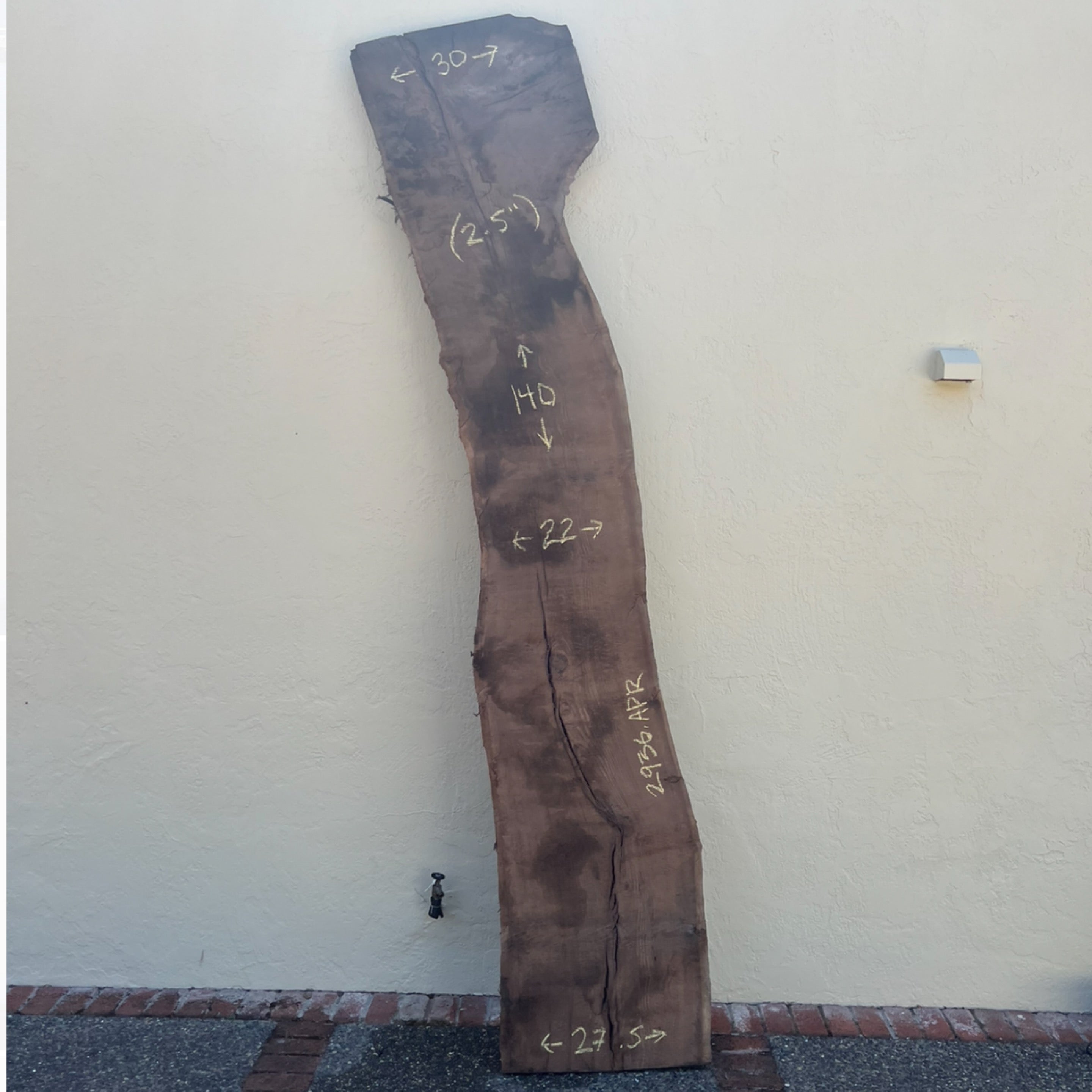 Claro Walnut slab from Peroba Reclaimed measuring 2.5" thick x 30"-22"-27.5" wide x 140" long