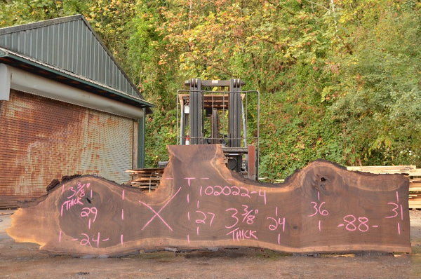 Black Walnut slab from Goby Walnut measuring 3.375" thick x 27"-24"-36"-31" wide x 88" long