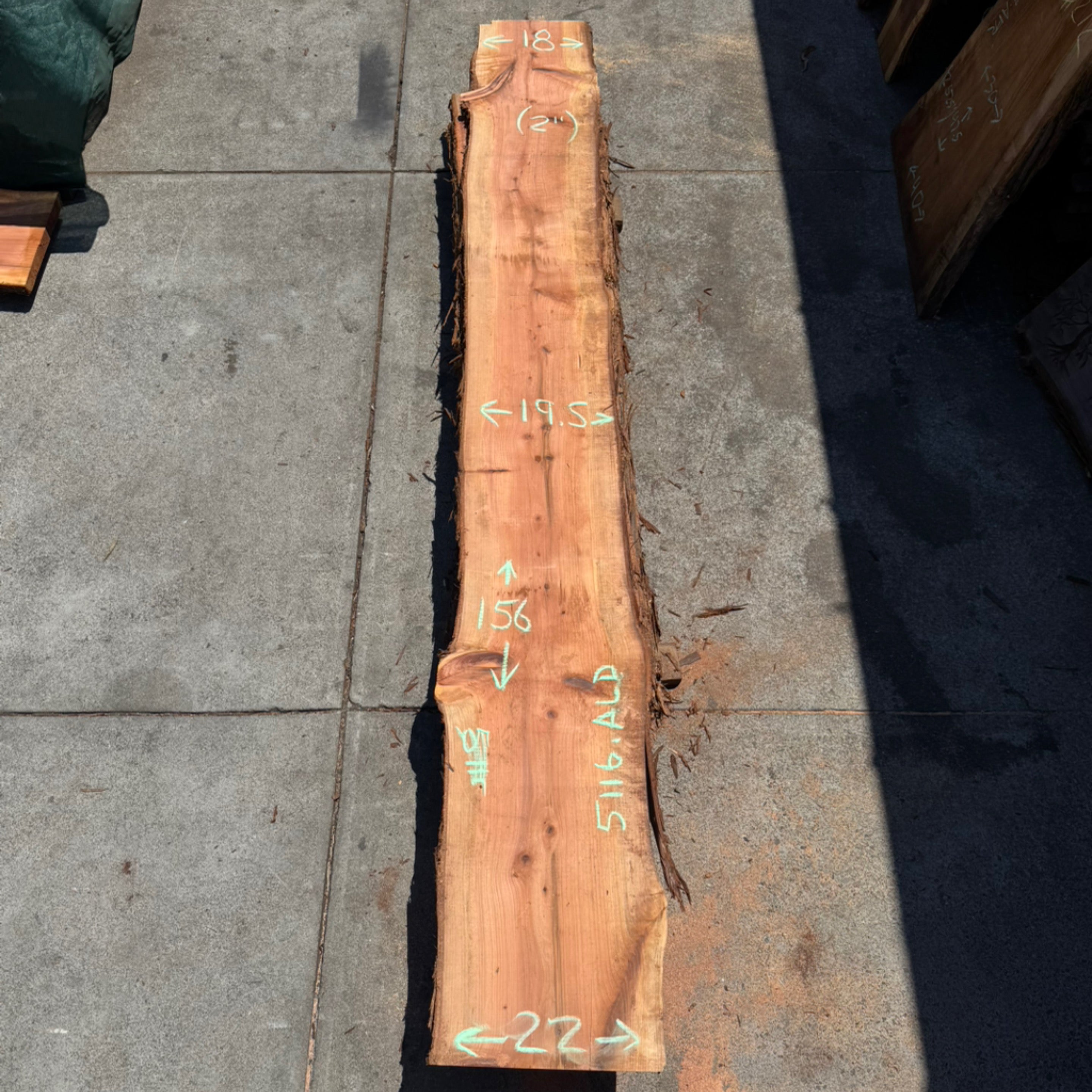 Redwood slab from Peroba Reclaimed measuring 2" thick x 18"-19.5"-22" wide x 156" long
