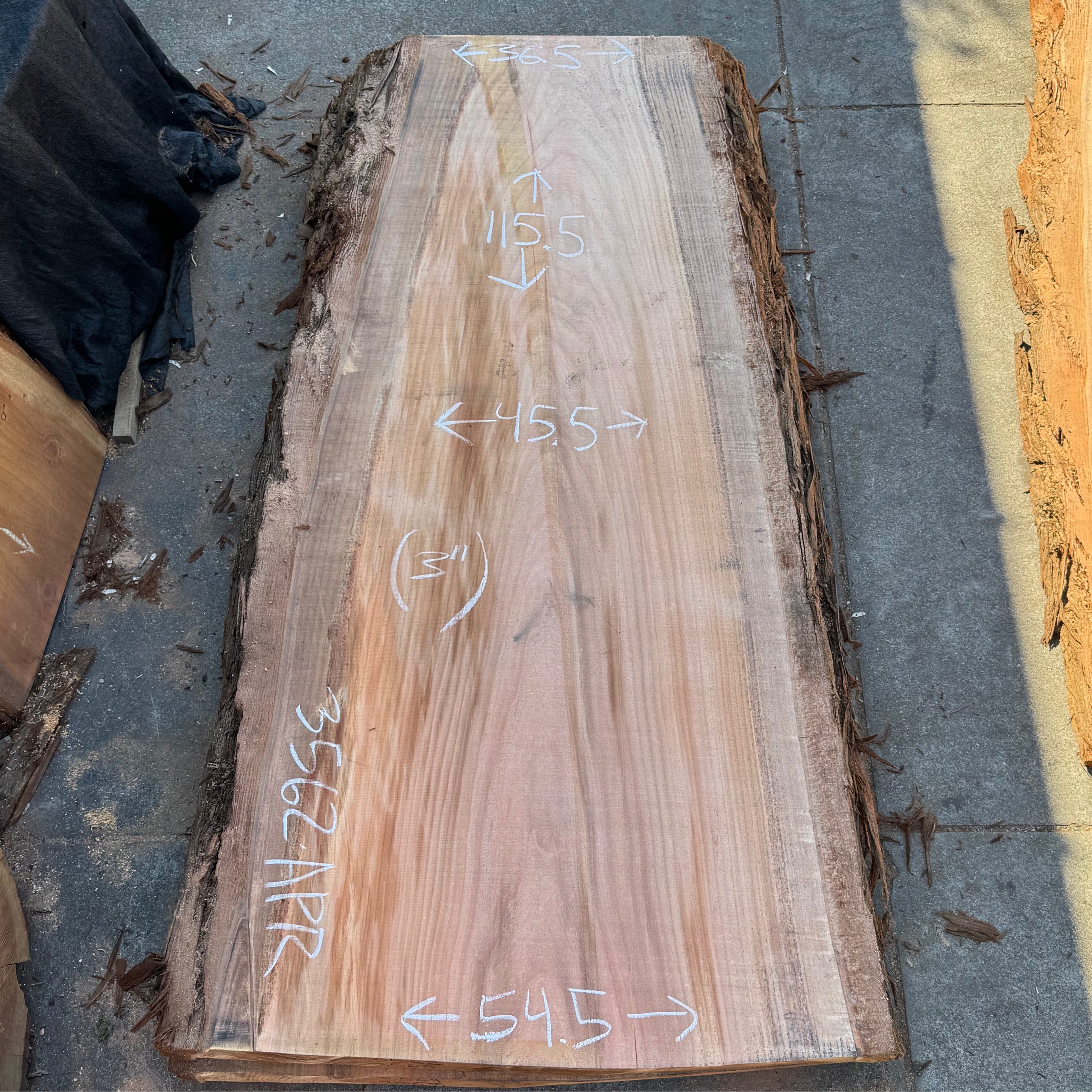 Redwood slab from Peroba Reclaimed measuring 3" thick x 36.5"-45.5"-54.5" wide x 115.5" long