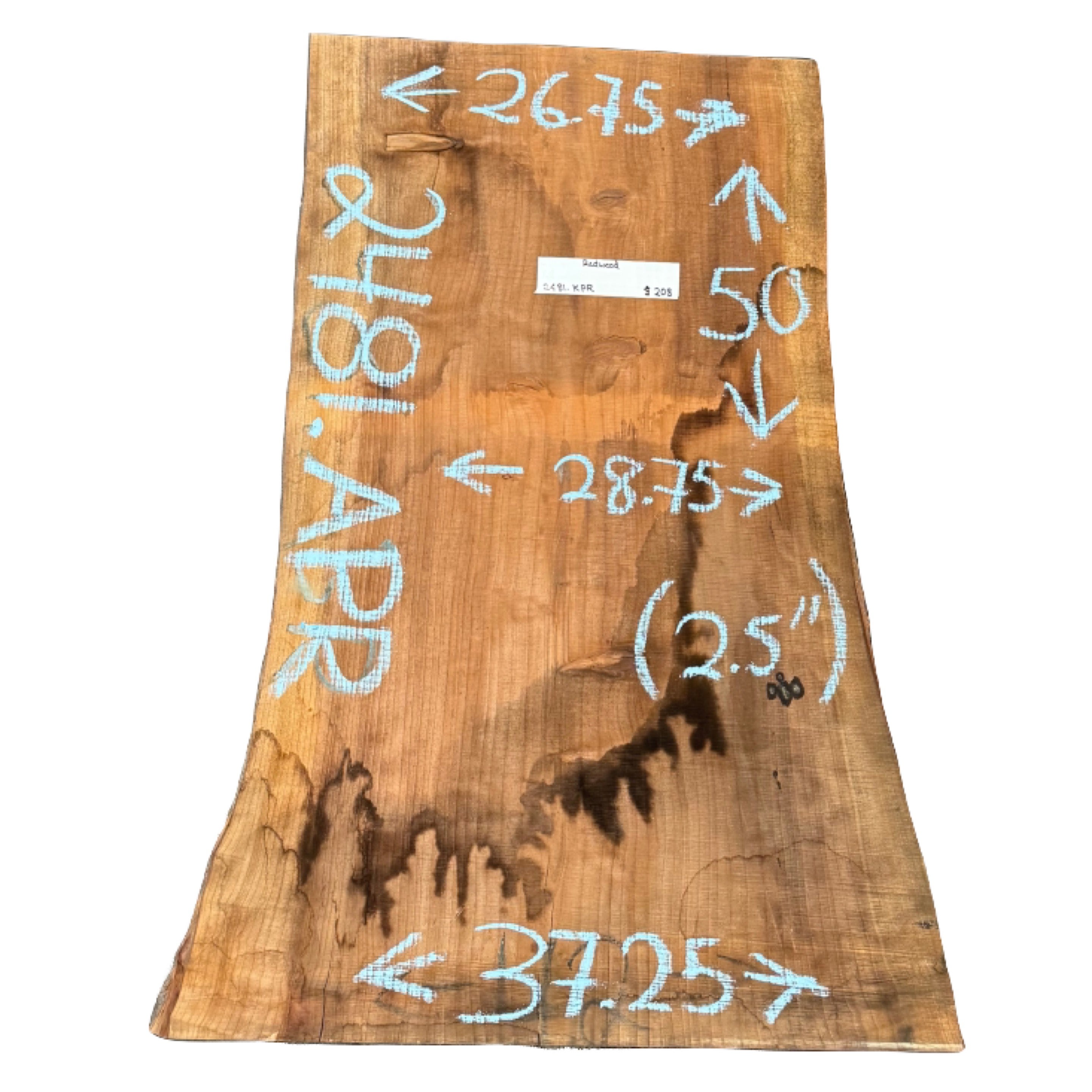Redwood slab from Peroba Reclaimed measuring 2.5" thick x 26.75"-28.75"-37.25" wide x 50" long