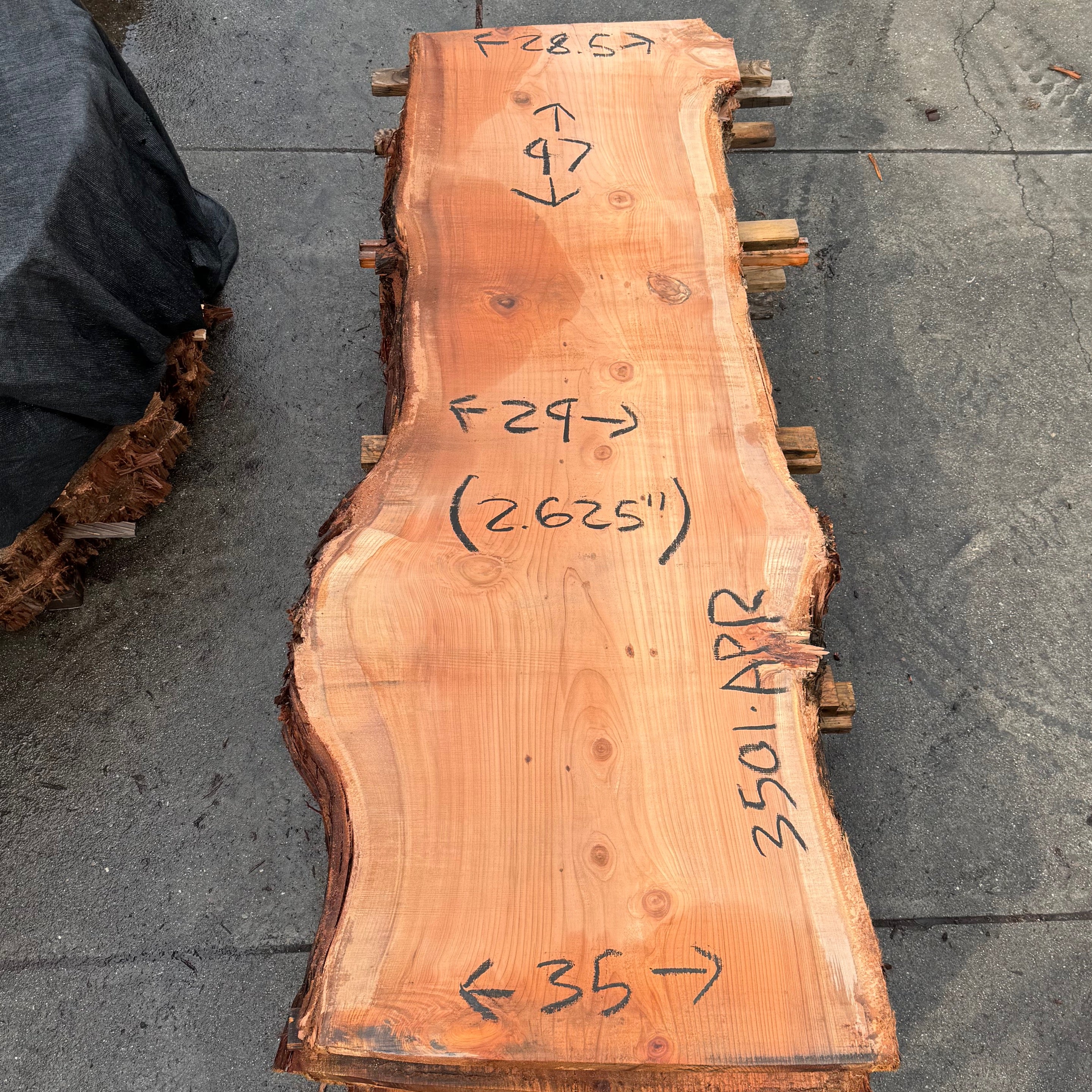 Redwood slab from Peroba Reclaimed measuring 2.625" thick x 28.5"-29"-35" wide x 97" long