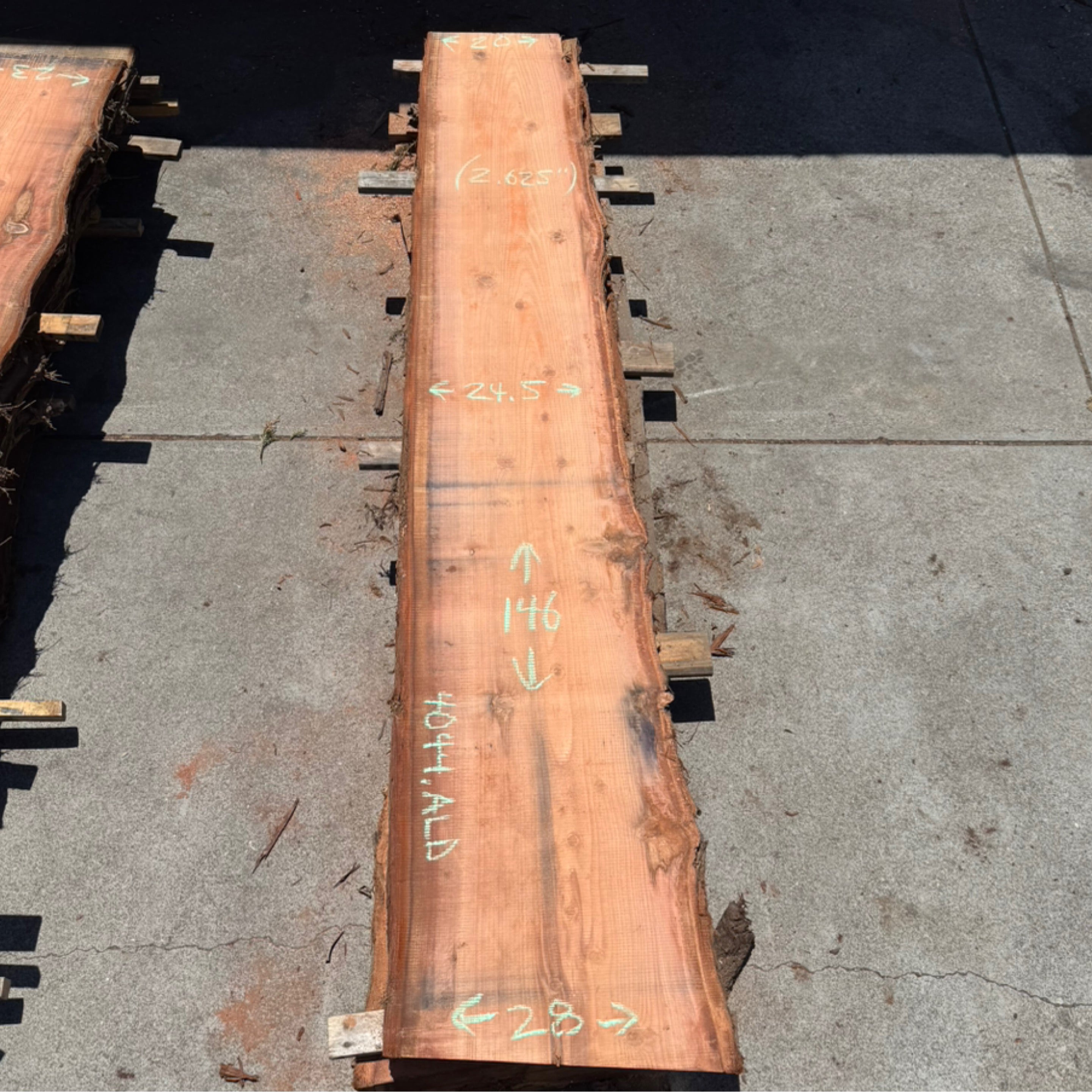 Redwood slab from Peroba Reclaimed measuring 2.625" thick x 20"-24.5"-28" wide x 146" long
